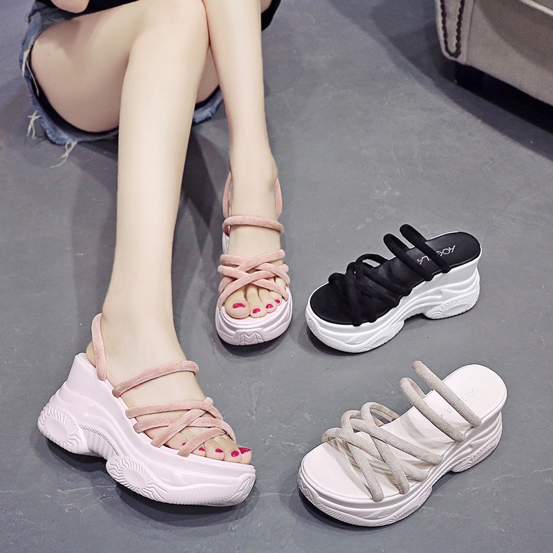 2023 Summer new 9cm HEIGHTENING SANDALS WOMEN'S THICK BOTTOM 100 LAP OUTSIDE WEARING SLIPPERS SLOTH SHOES PINE PASTRY SEMI-TUG-TAOBAO