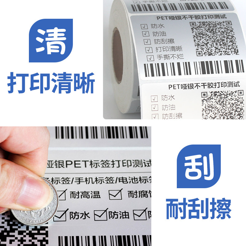 Silver label paper adhesive waterproof pet 60x 40 100*100 50 90 anti-tear and anti-oil carbon tape printing bar code fixed assets medical label high temperature resistant dumb silver sticker can be fixed