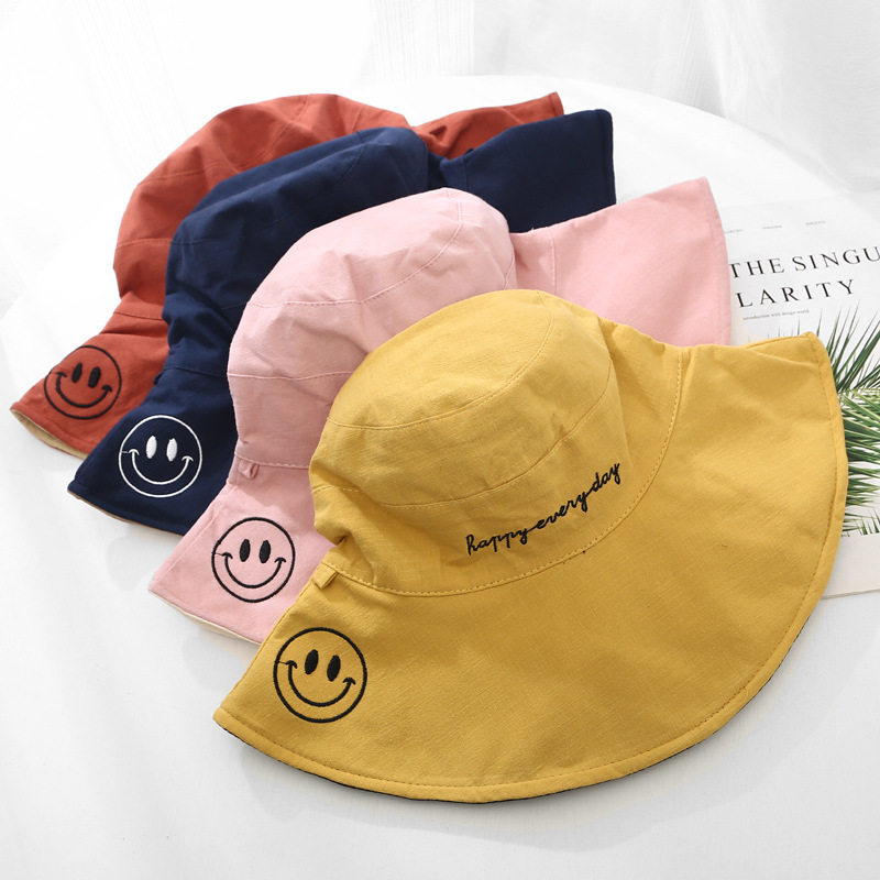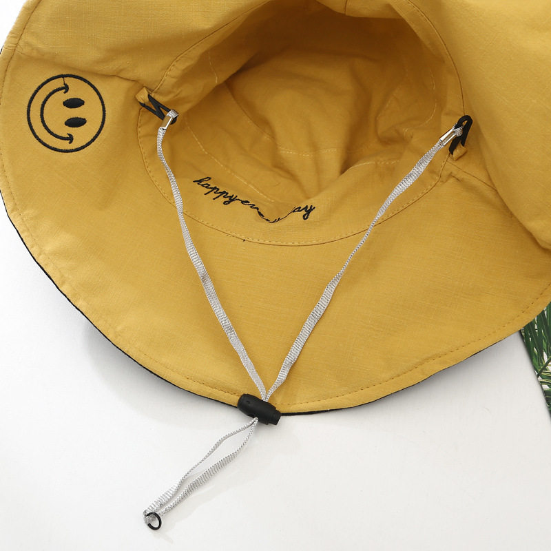 Big brimmed hat with big smiley face-yellow big brimmed hat with big smiling face-pink big brimmed hat with big smiling face-caramel big brimmed hat with big brimmed face-navy blue, yellow and black Strawberry-fisherman hat, yellow and black Busy growing up-fisherman hat plain color oversized