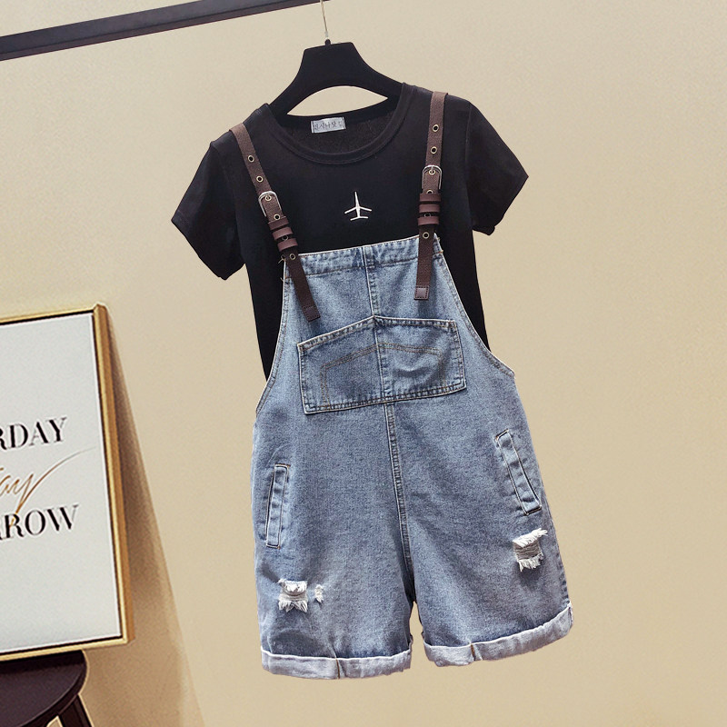 Baby bag pants women's 2021 summer new Korean version of age reduction loose thin large pocket hole denim shorts two-piece suit
