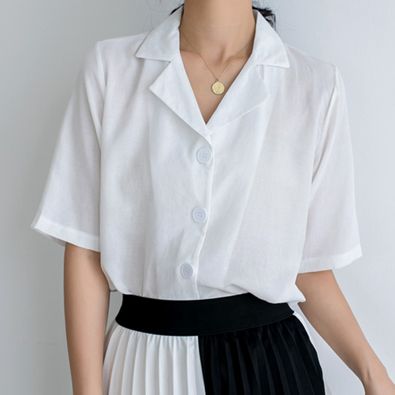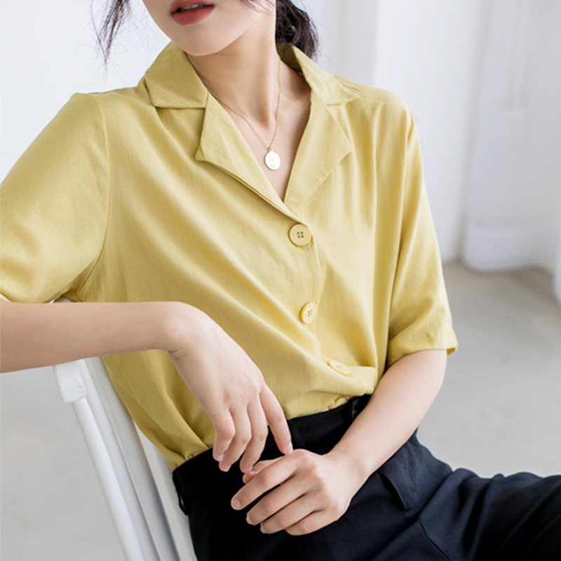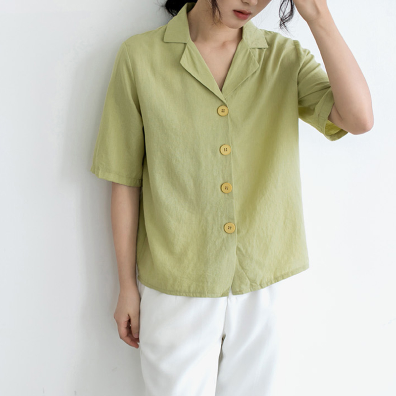 2021 summer new suit collar avocado green cotton linen shirt women's French temperament V-neck top short-sleeved shirt
