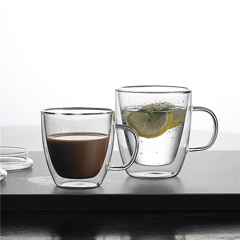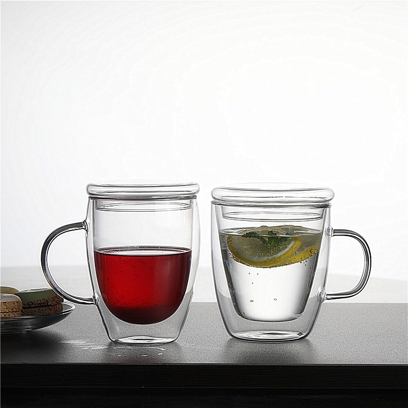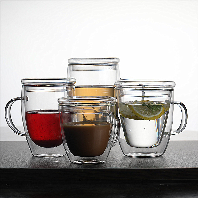 Double-layer heat-resistant glass cup with lid tea coffee cup office water cup transparent flower tea cup household milk cup insulated cup