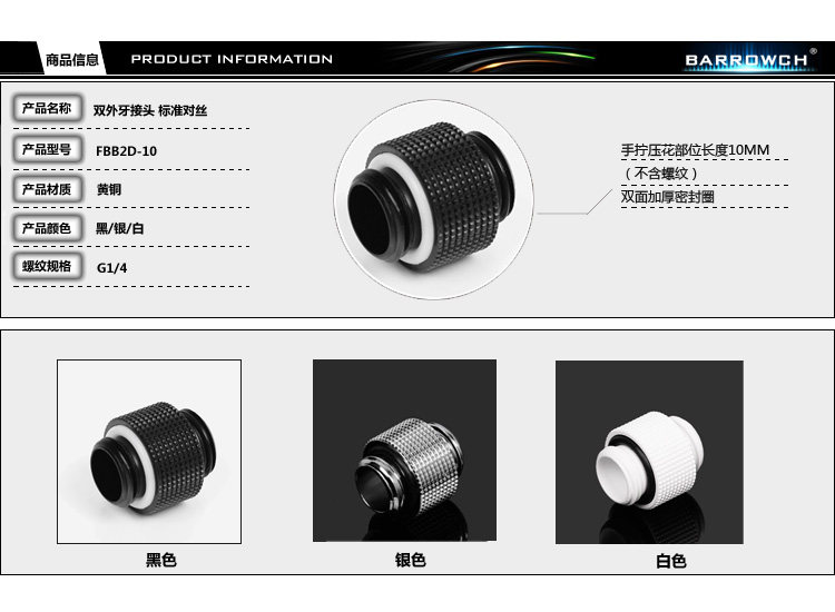 Barrowch G1 4 black bright silver white double external tooth joint standard double male screw FBB2D-10 water cooling fittings