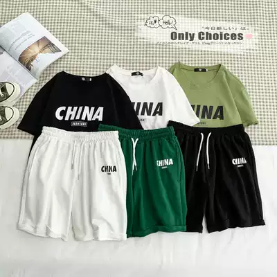 Summer printed short-sleeved men's loose T-shirt suit Korean fashion casual Joker shorts half-sleeved lovers tide