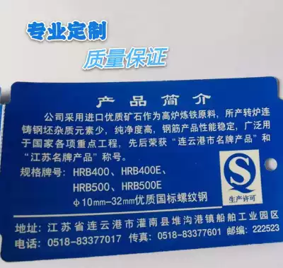 Custom-made steel bar signs, steel bar tags, Lianyungang Xingxin waterproof, tear-proof, roll-up steel bar cards, aluminum cards