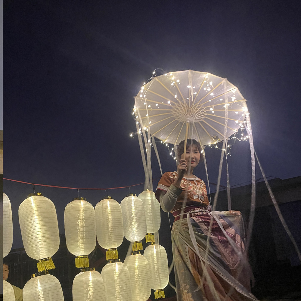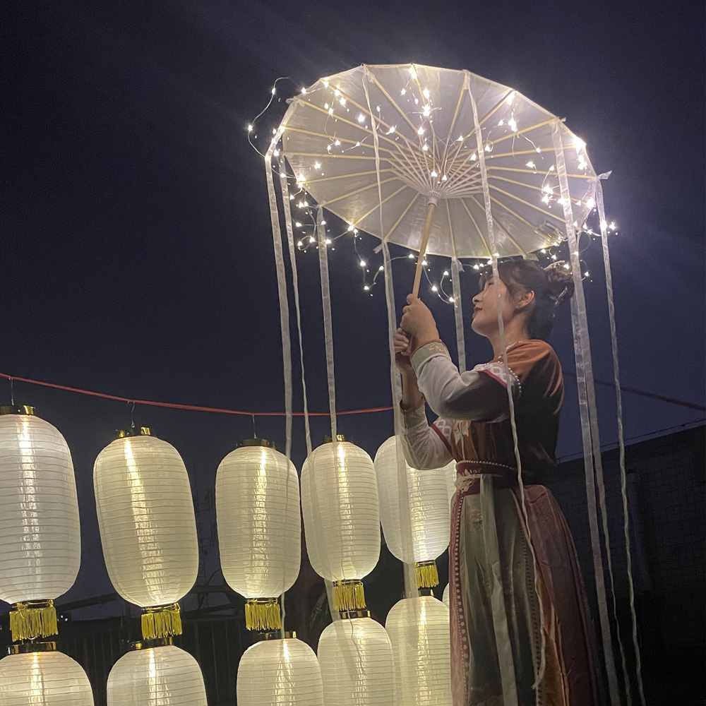 Antique creative shooting supplies night light umbrella Hanfu location shooting live props white ribbon umbrella performance umbrella