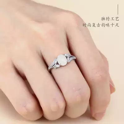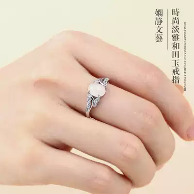 Xinjiang Hetian Jade sheep fat jade stone ring female simple atmosphere 925 sterling silver opening ring tail ring give gift