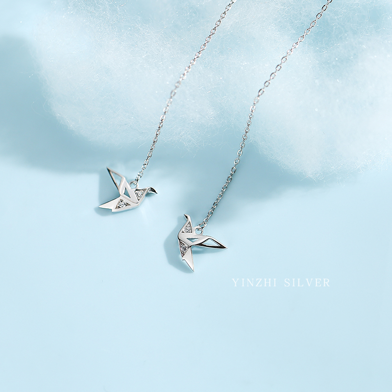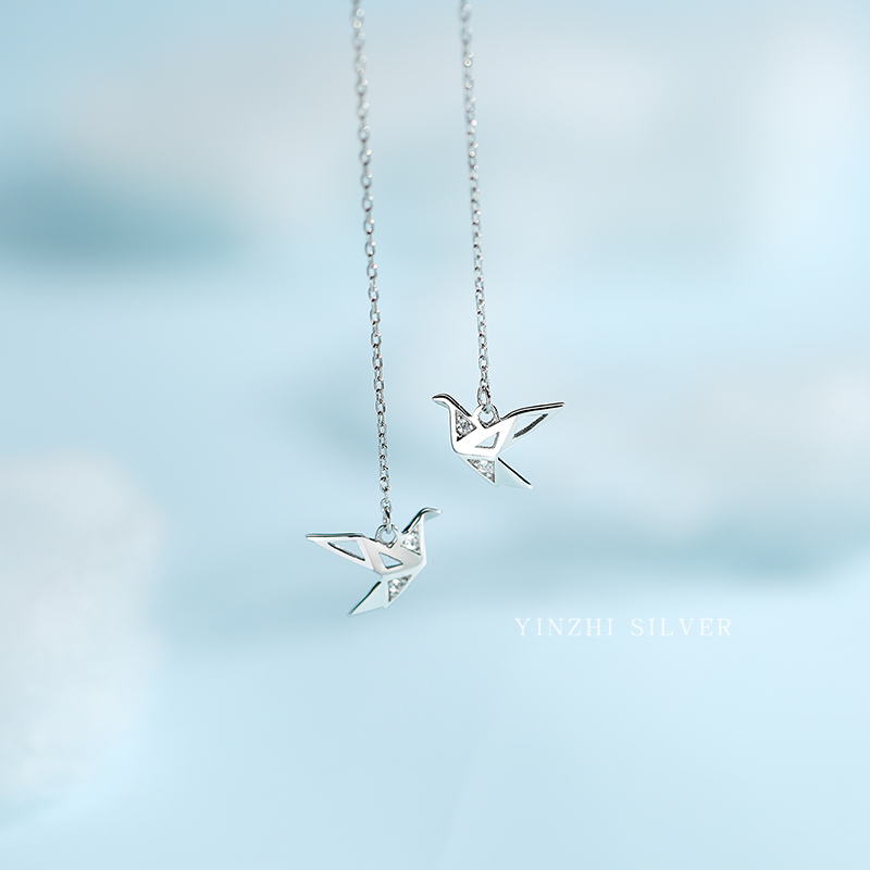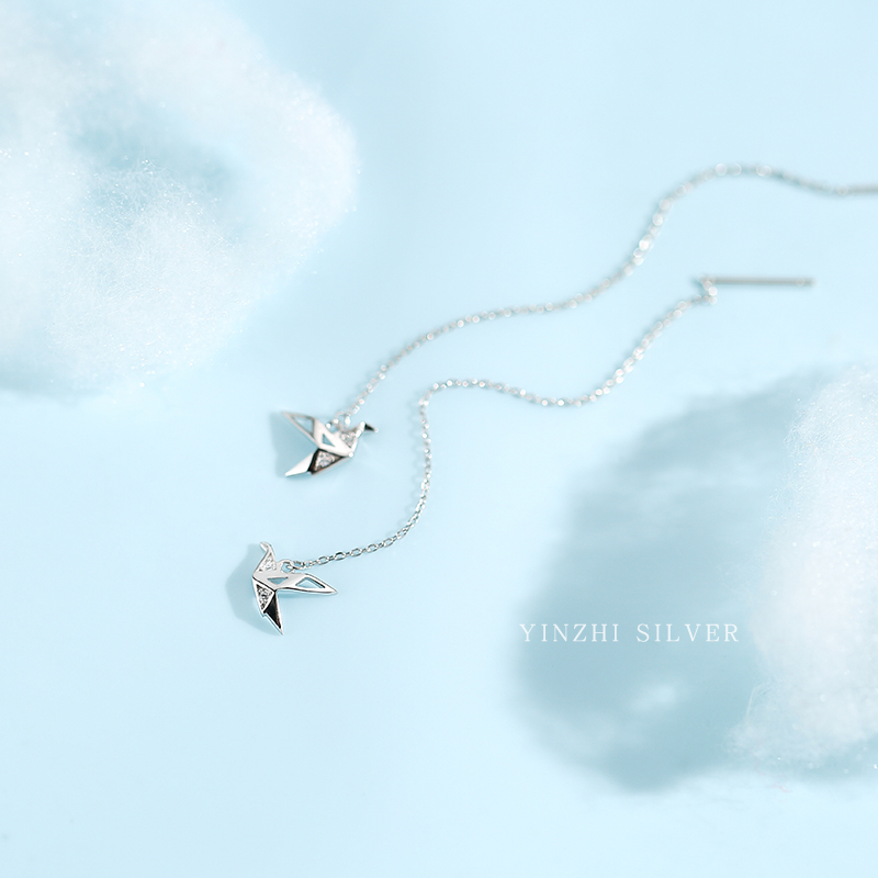 Sterling silver thousand paper crane tassel ear liner women's 2021 new trend niche design sense earrings long autumn and winter earrings