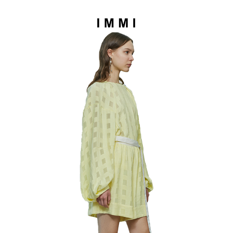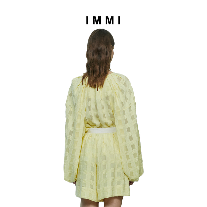 (Designer brand IMMI)Lemon yellow green plaid jacquard chiffon waist top 191ST039