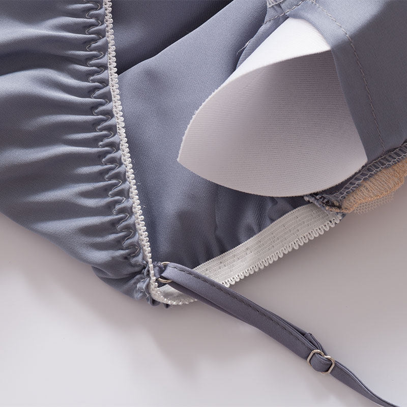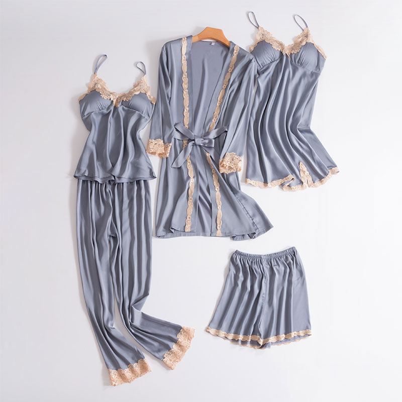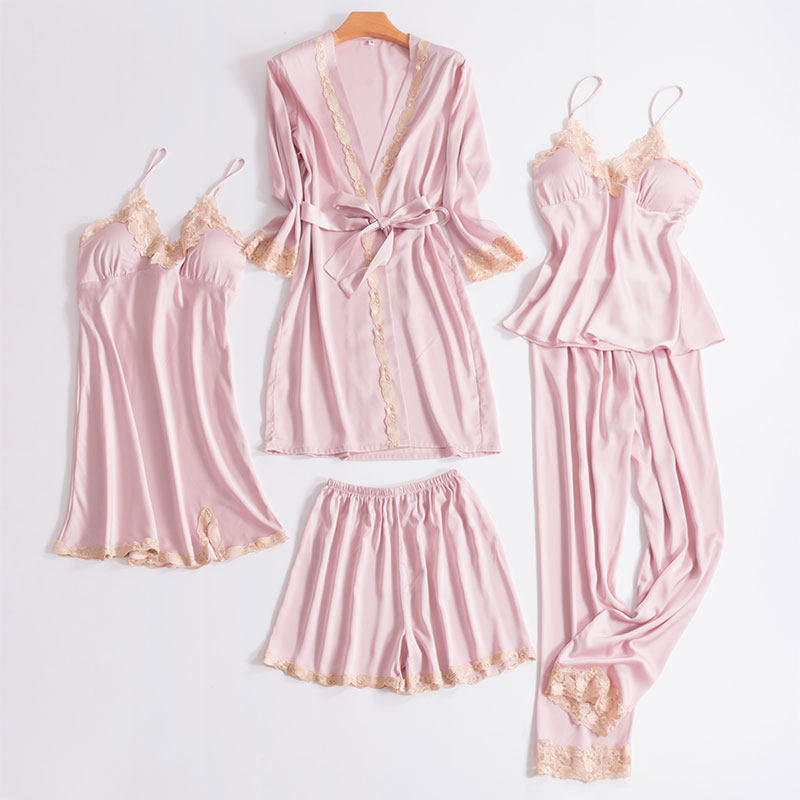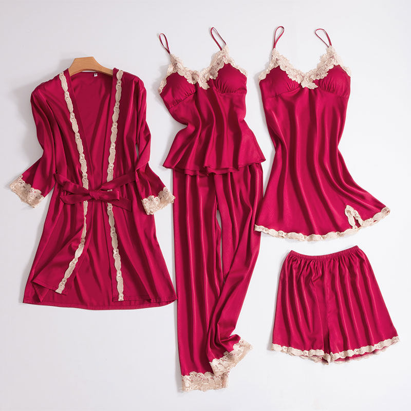Silk pajamas women's spring and Autumn thin ice silk sling sexy with chest pad five-piece set Women's silk home suit set