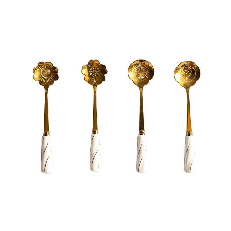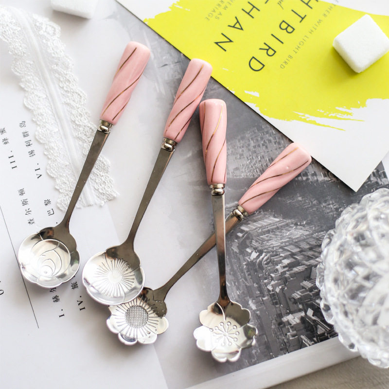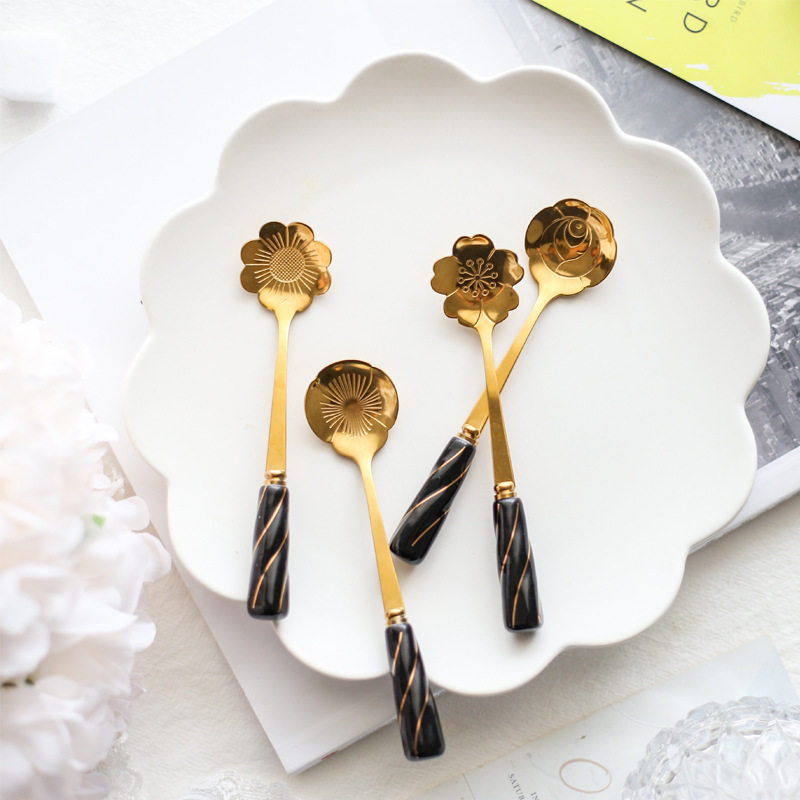 Creative Cherry Blossom Golden Ceramic Coffee Stirring Spoon Day Style Stainless Steel Petals Girl Hearts Delicate Sweet Spoons