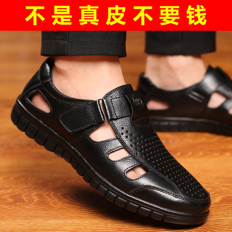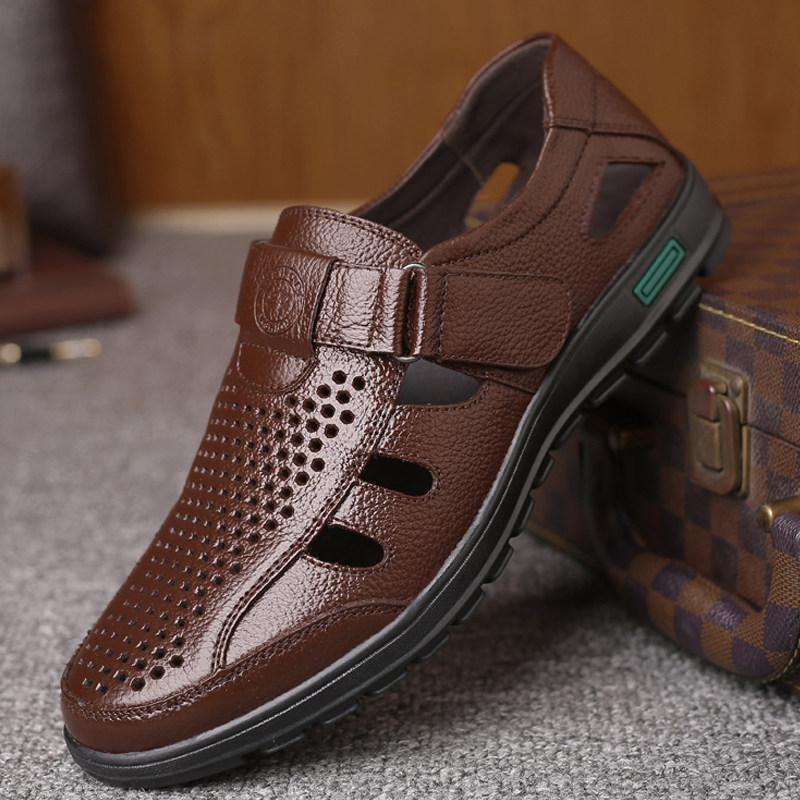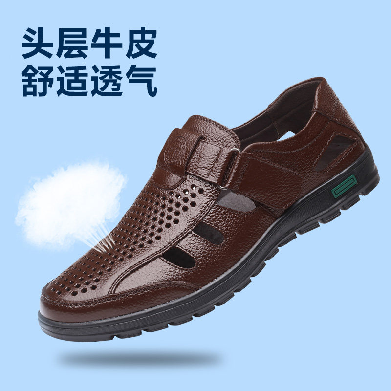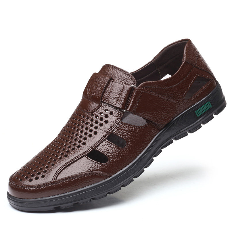 Men's sandals leather summer breathable hollow hole shoes Baotou middle-aged and elderly father and father casual elderly leather shoes