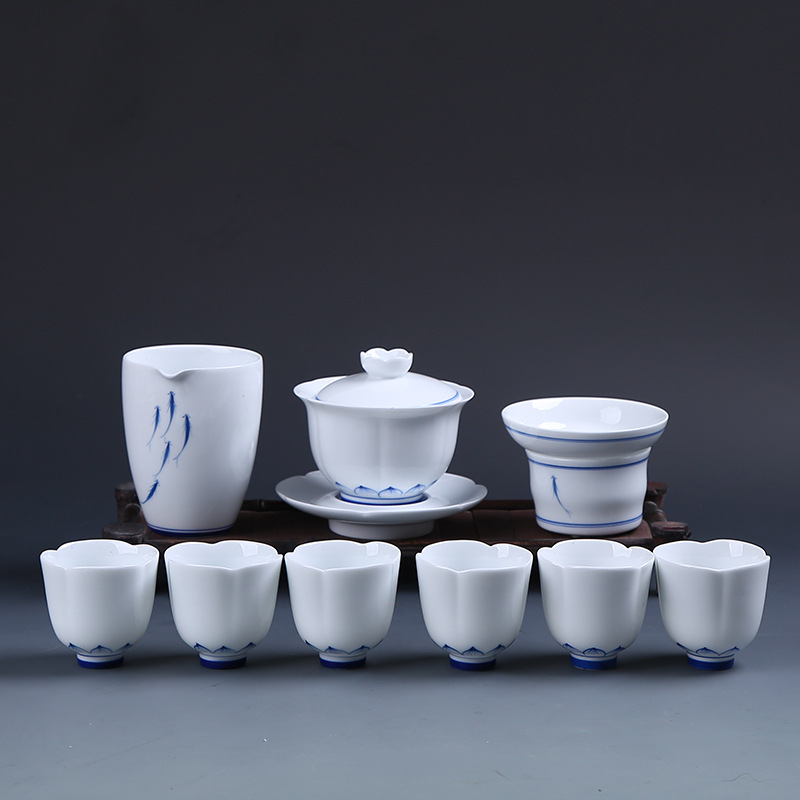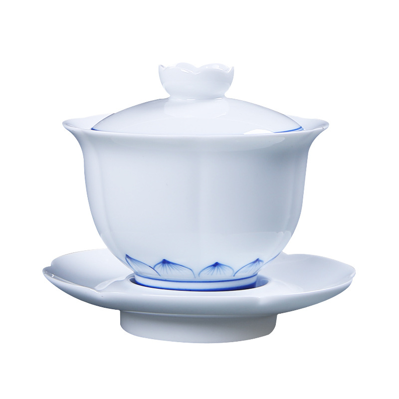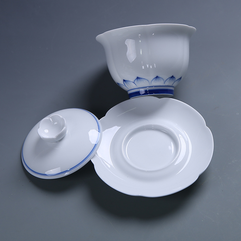 Hand-painted lotus blue and white porcelain bowl teacup handmade retro white porcelain kung fu tea set tea bowl three talents large tea bowl