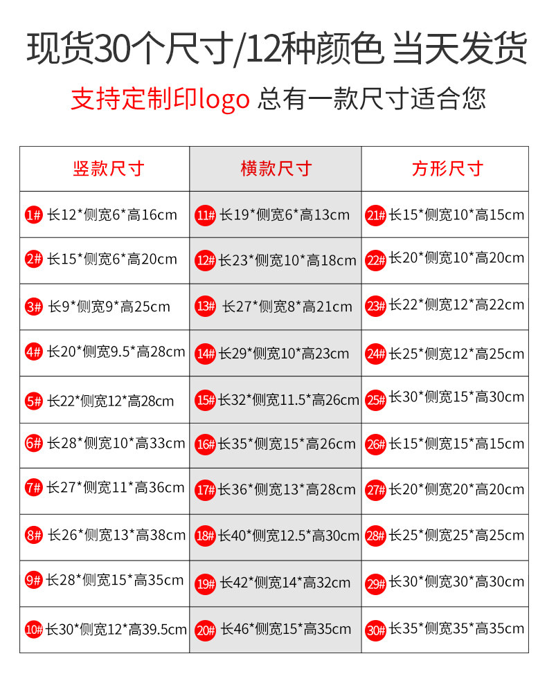 Private Customization Hot Stamping Logo Special Auction Please contact customer service 1# vertical model - length 12 side width 6 height 16 (thickened bottom card) 2# vertical model - length 15 side width 6 height 20 (thickened bottom card) 3# vertical model - length 9 side width 9 height 25 (thickened bottom card) 4# vertical model - length 20 side width 9.5 height 28 (thickened bottom card) 5# vertical model - long 22 side width 12 height 28 (thickened bottom card) 6# vertical model - length 28 side width 10 height 33 (thickened bottom card) 7 #竖款 - Length 27 Side Width 11 Height 36 (Thickened Bottom Card) 8# Vertical Model - Length 26 Side Width 13 Height 38 (Thickened Bottom Card) 9# Vertical Model - Length 28 Side Width 15 Height 35 (Thickened Bottom Card) 10# Vertical Model - Length 30 Side Width 12 Height 40 (Thickened Bottom Card) 11# Horizontal Model - Length 19 Side Width 6 Height 13 (Thickened Bottom Card) 12# Horizontal Model - Length 23 Side Width 10 Height 18 (Thickened Bottom Card) 13# Horizontal Model - Length 27 Side Width 8 Height 21 (Thickened Bottom Card) 14 #横款 - Length 29 Side Width 10 Height 23 (Thickened Bottom Card) 15# Horizontal Model - Length 32 Side Width 11.5 Height 26 (Thickened Bottom Card) 16# Horizontal Model - Length 35 Side Width 15 Height 26 (Thickened Bottom Card) 17# Horizontal Model - Length 36 Side Width 13 Height 28 (Thickened Bottom Card) 18# Horizontal Model - Length 40 Side Width 12.5 Height 30 (Thickened Bottom Card) 19# Horizontal Model - Length 42 Side Width 14 Height 32 (Thickened Bottom Card) 20# Horizontal Model - Length 46 Side Width 15 Height 35 (Thickened Bottom Card) 21 #方形 - Length 15 Side Width 10 Height 15 (Thickened Bottom Card) 22# Square - Length 20 Side Width 10 Height 20 (Thickened Bottom Card) 23# Square - Length 22 Side Width 12 Height 22 (Thickened Bottom Card) 24# Square - Length 25 Side Width 12 Height 25 (Thickened Bottom Card) 25# Square - Length 30 Side Width 15 Height 30 (Thickened Bottom Card) 26# Square - Length 15 Side Width 15 Height 15 (Thickened Bottom Card) 27# Square - Length 20 Side Width 20 Height 20 (Thickened Bottom Card) 28 #方形- Length 25 Side Width 25 Height 25 (Thickened Bottom Card) 29# Square - Length 30 Side Width 30 Height 30 (Thickened Bottom Card) 30# Square - Length 35 Side Width 35 Height 35 (Thickened Bottom Card)