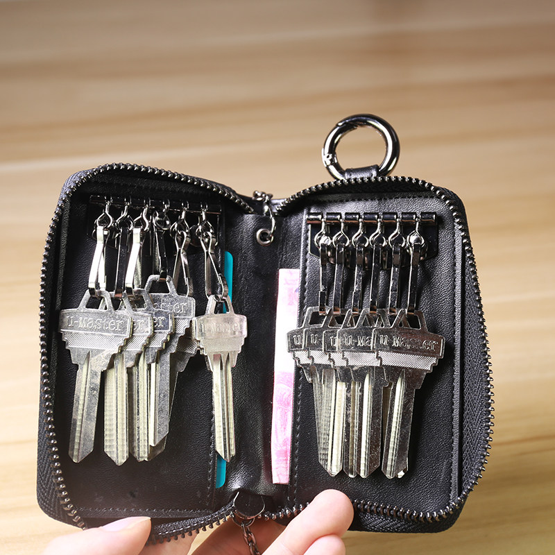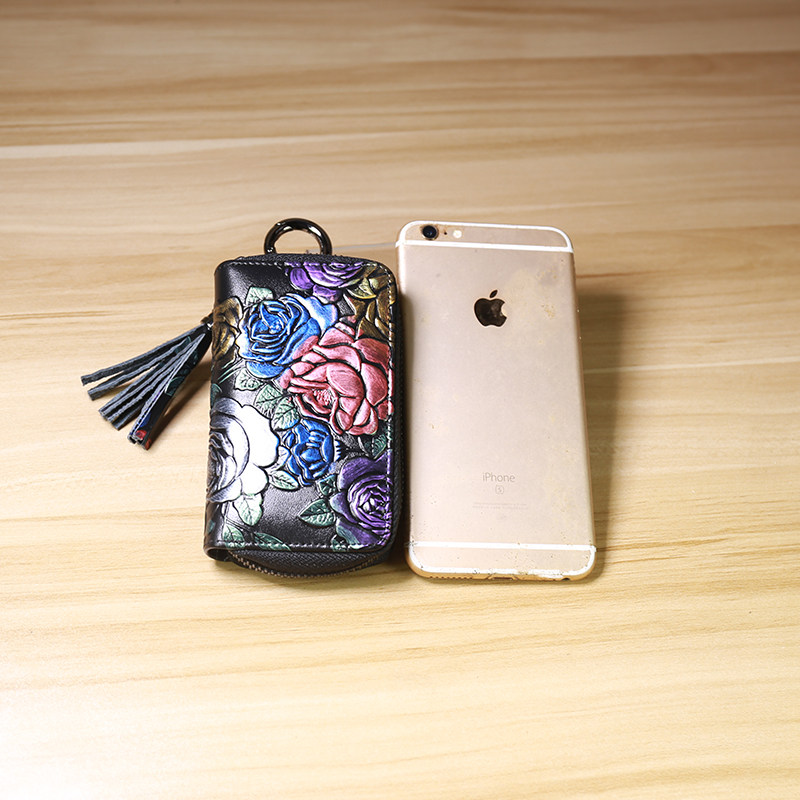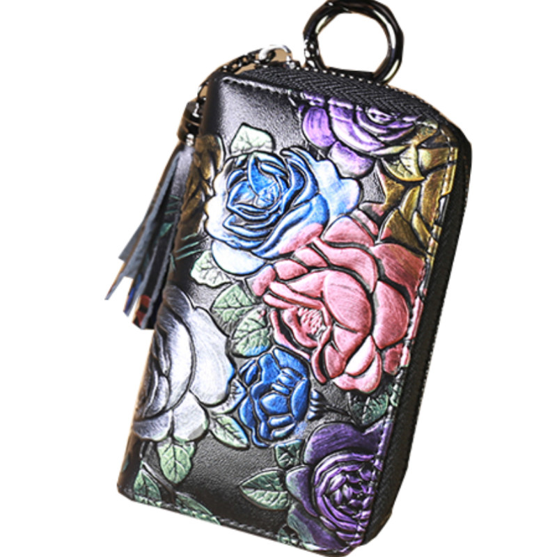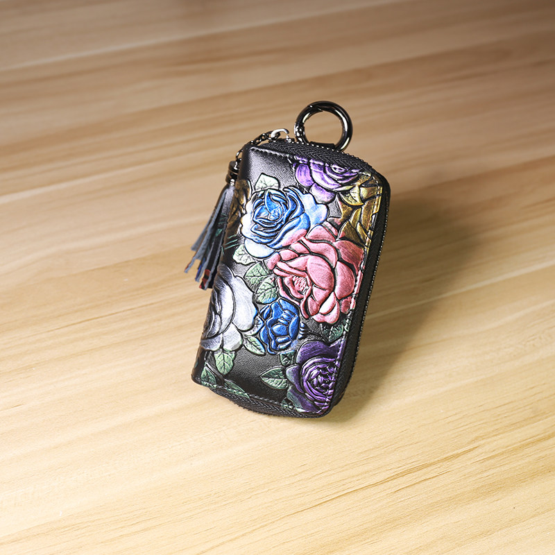 Cowhide key bag female celebrity style rose pattern large capacity pull chain card bag car multi-function keychain double row