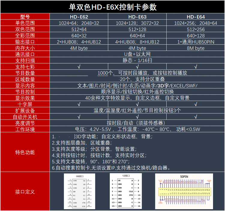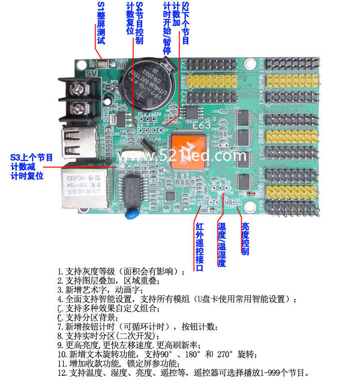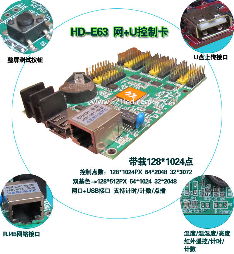 HD-E63 Grayscale technology Network interface display LED control card Timing counting on-demand weather forecast