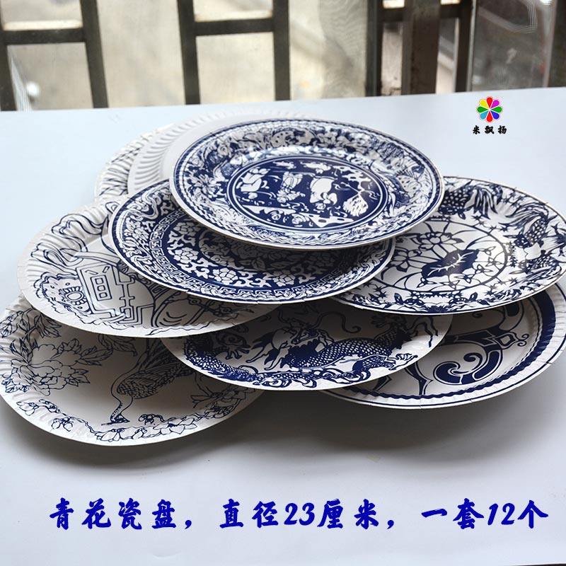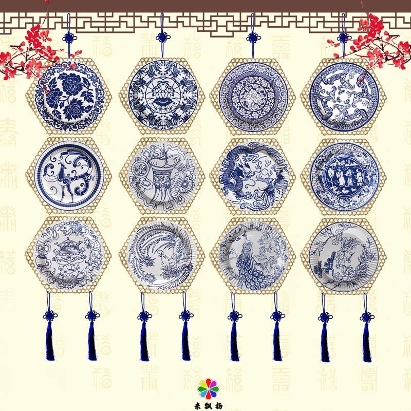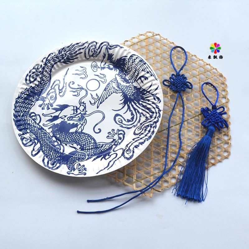 Six deformed bamboo woven 1 piece(diameter 28 cm)cardboard blue and white porcelain dishes 1 set of 12 blue Chinese knots(top and bottom) cardboard blue and white porcelain dishes Random 1 single-sided six deformed bamboo woven blue and white porcelain as shown in the figure