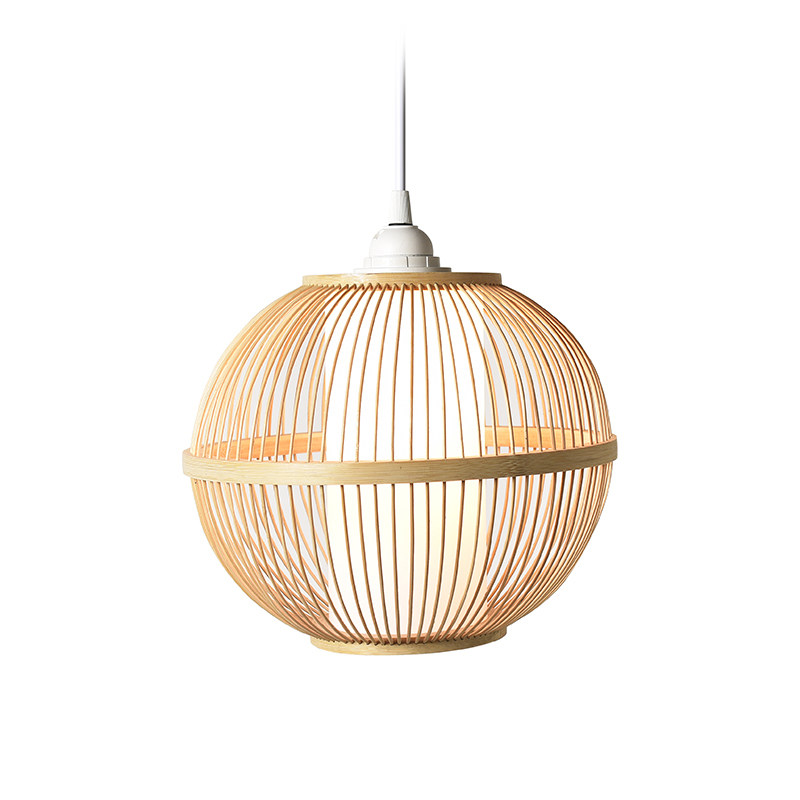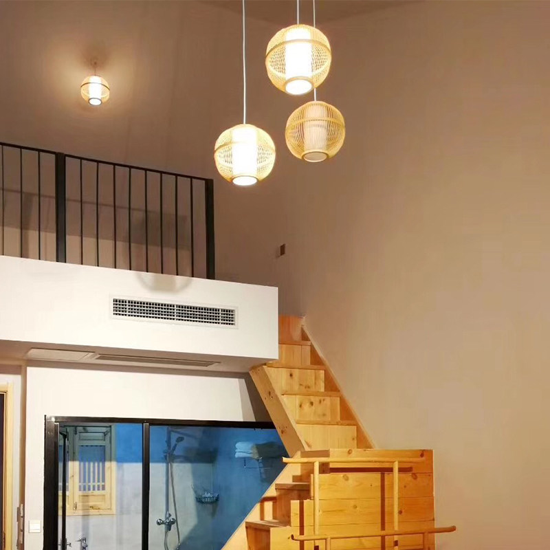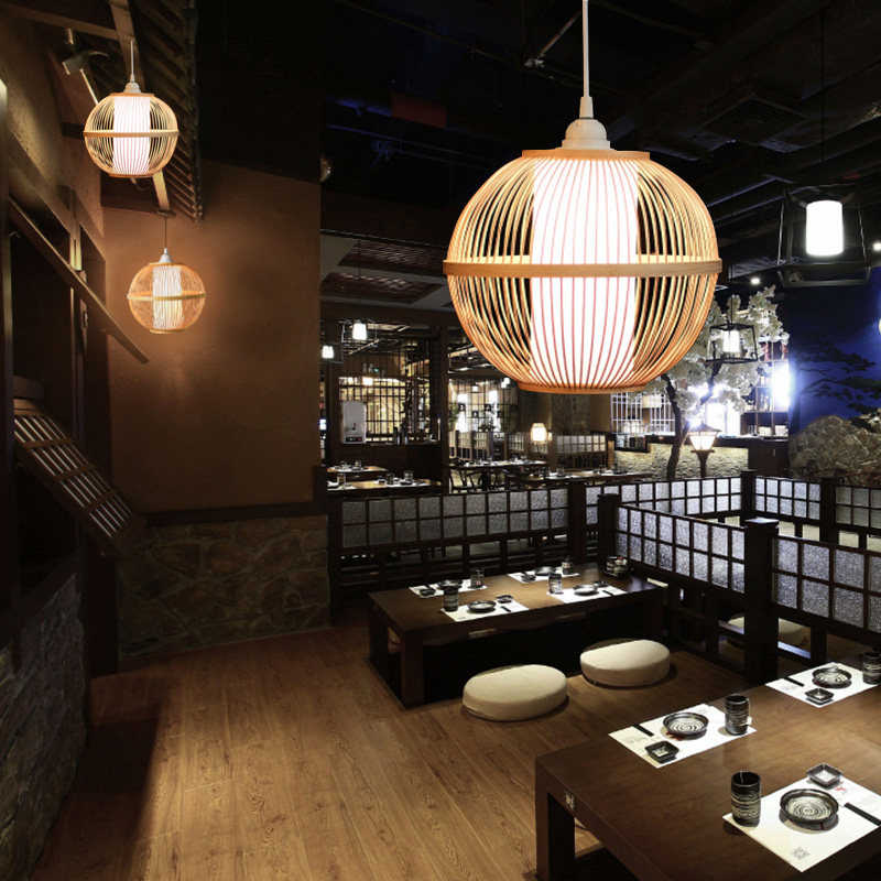 There are wooden bamboo chandeliers Japanese-style dining room lamps and lanterns three-head combination wooden new Chinese tea room bar Zen