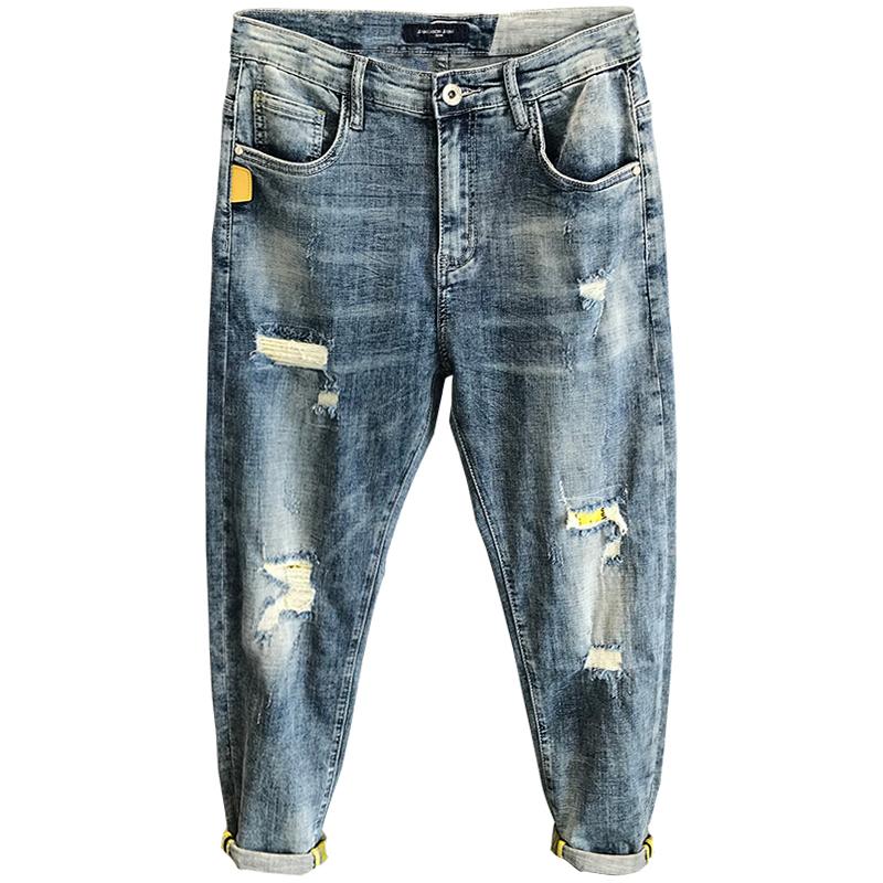 Hong Kong version of the tide brand retro light-colored ripped jeans men's slim cigarette pipe pants Summer thin section trend beggar pants