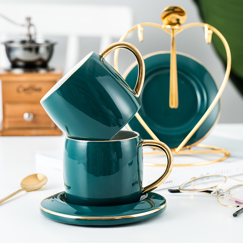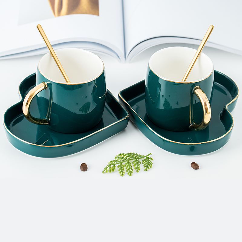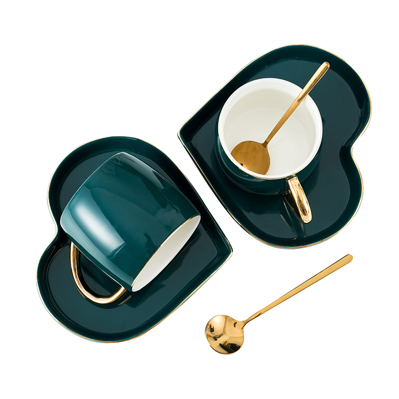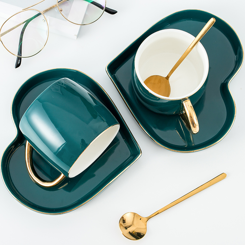 A pair of peacock green cups, 1 cup holder, 1 peacock green cup, 1 round saucer, 1 malachite green cup, 1 small peach heart dish, a pair of peacock green cups, 2 small peach heart dish, malachite green cups