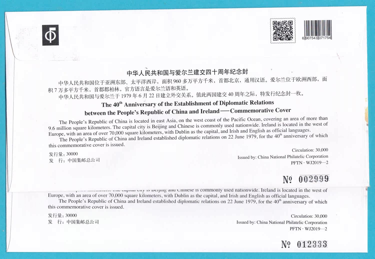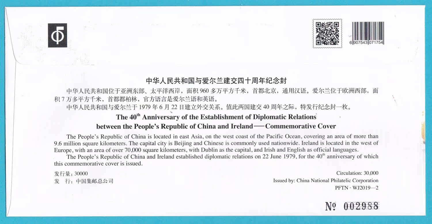 WJ2019-2 diplomatic seal on the 40 anniversary of the establishment of diplomatic relations between China and Ireland