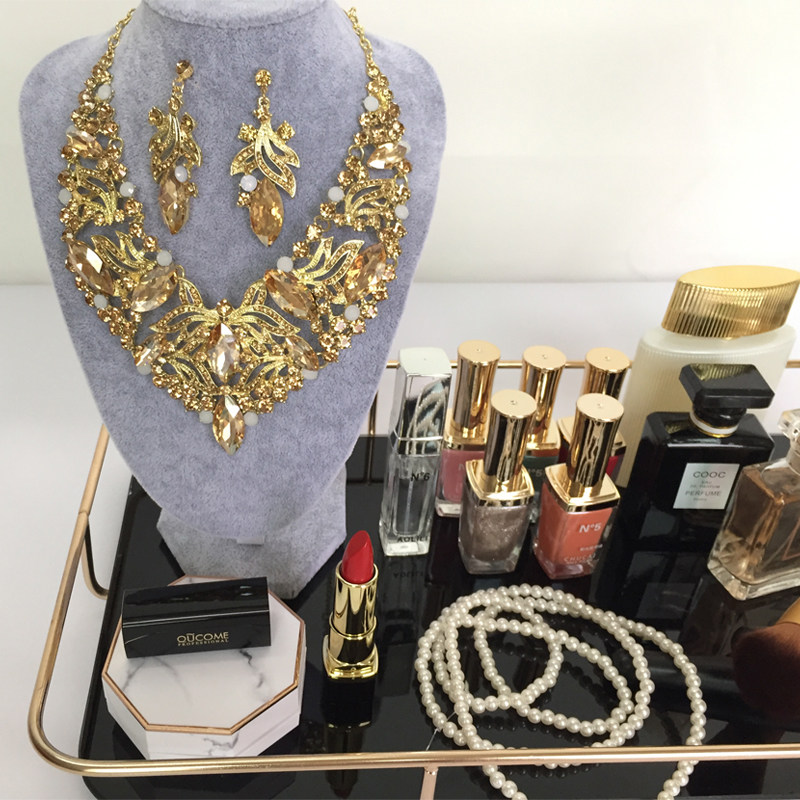 The whole set of a combination of a golden necklace, earrings (including neck mold), polygonal white air cushion lipstick, N°6 perfume (15ML), nail polish (5 colors), pearl necklace, white perfume (100ML) fragrance