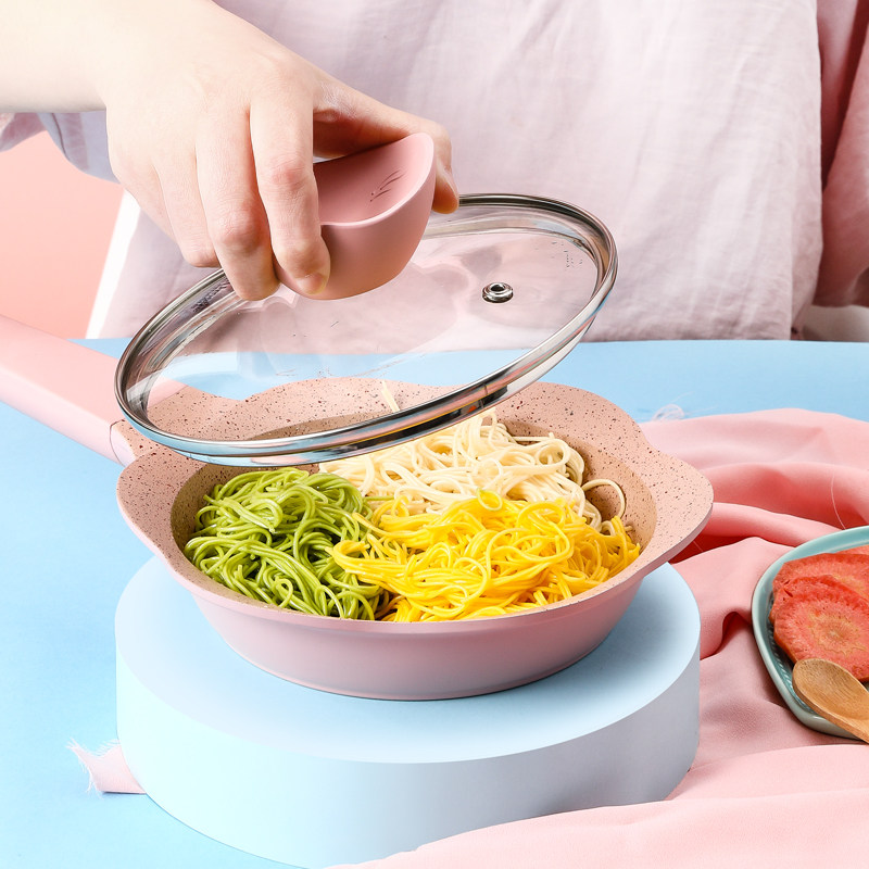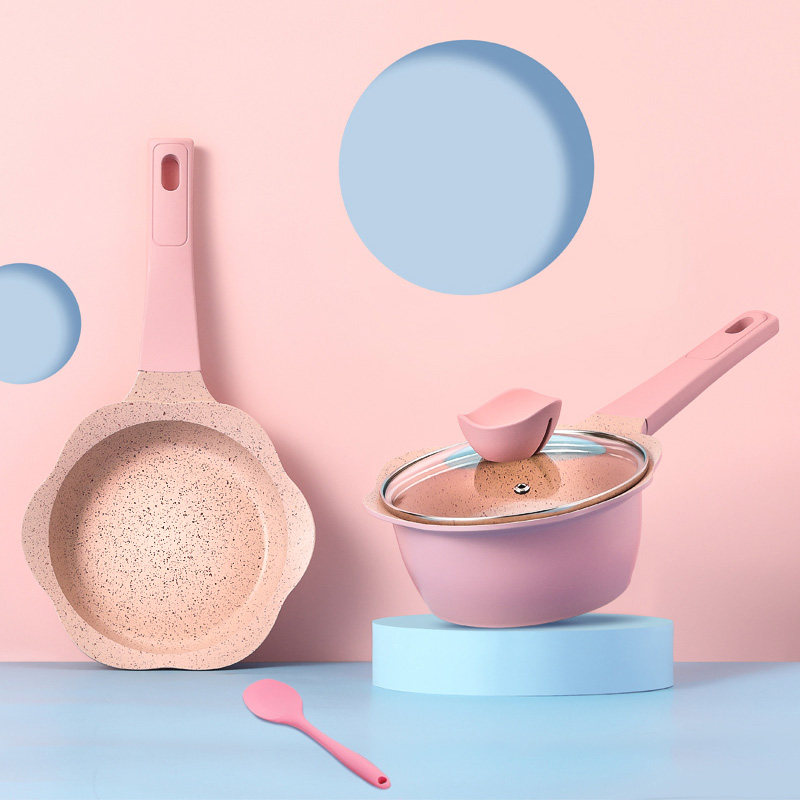 Red frying pan + silicone spatula Pink frying pan + silicone spatula Red frying pan + pot lid + silicone spatula Pink frying pan + pot lid + silicone spatula Red cooking pan + silicone spatula Red cooking pan + silicone spatula + steamer Red cooking pan + frying pan + silicone spatula Red cooking pan + frying pan + frying pan + silicone spatula + steamer