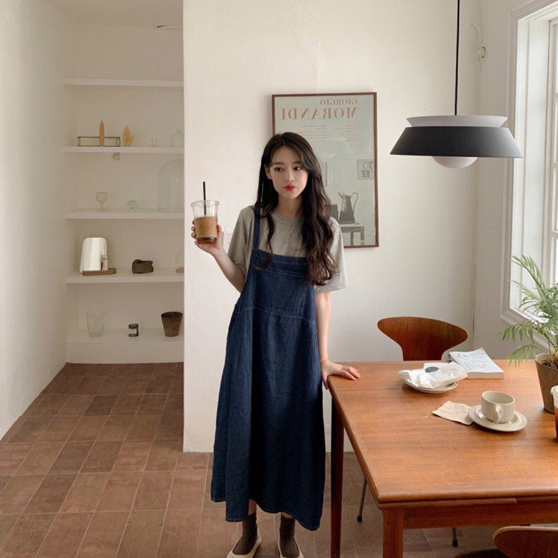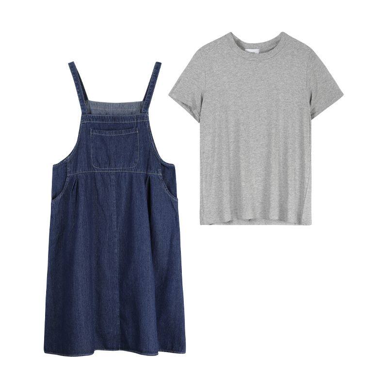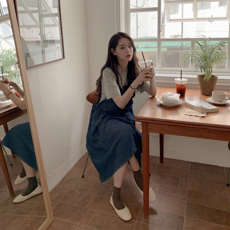 Denim long dress Slim Crowdlaw First Love Chic Two-style Suit Retro Port Wind Cuddling Bags Foreign Dress Children Summer