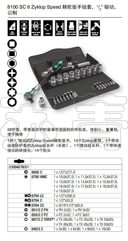 German Wera Vera Zyklop 8100SC6 drive ratchet wrench socket 28-piece set 1 2 inches