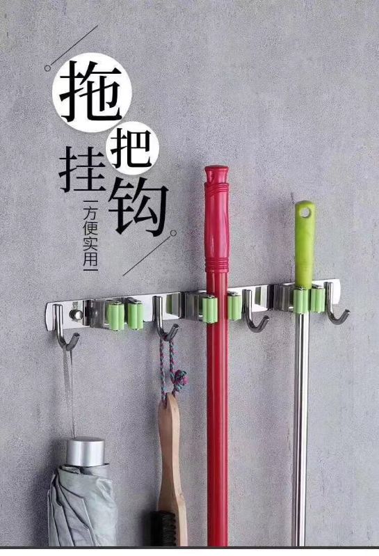 Mop hook free punching wall hanging toilet strong sticky hook stainless steel clothes hook row clip broom mop rack artifact