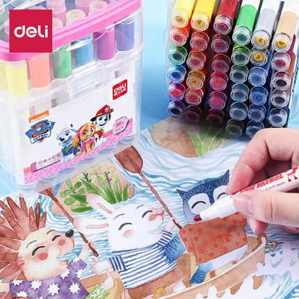 Deli Wang Wang Team seal watercolor pen box portable 12 24 36-color pink blue boys and girls washable kindergarten art coloring square Portable large-capacity thick pen with safety pores 7069