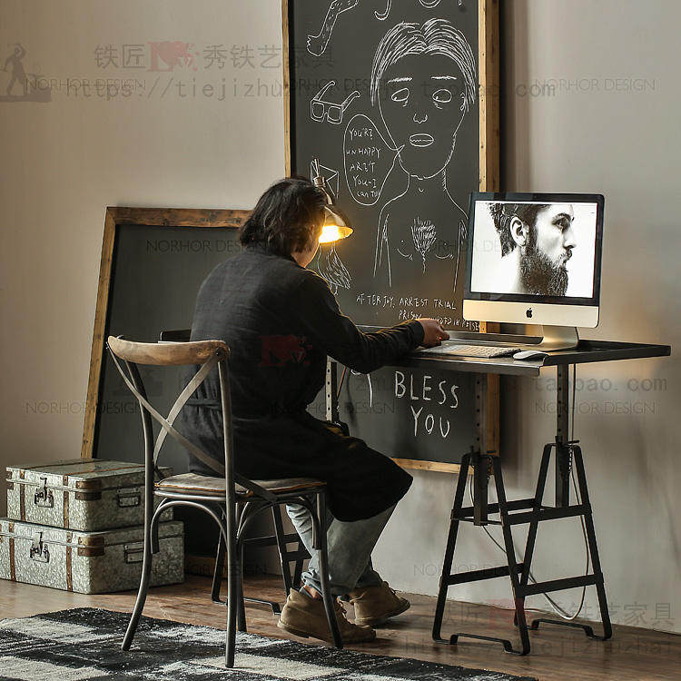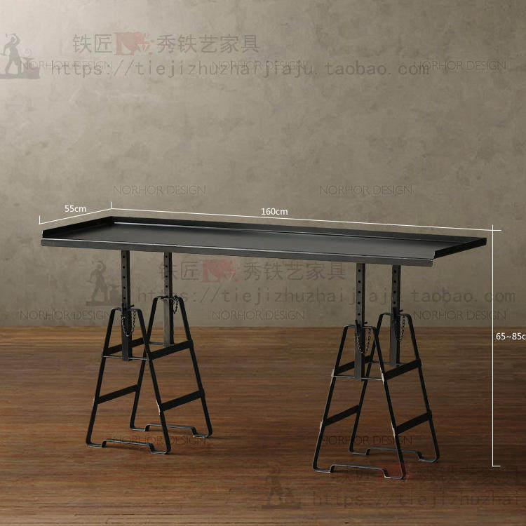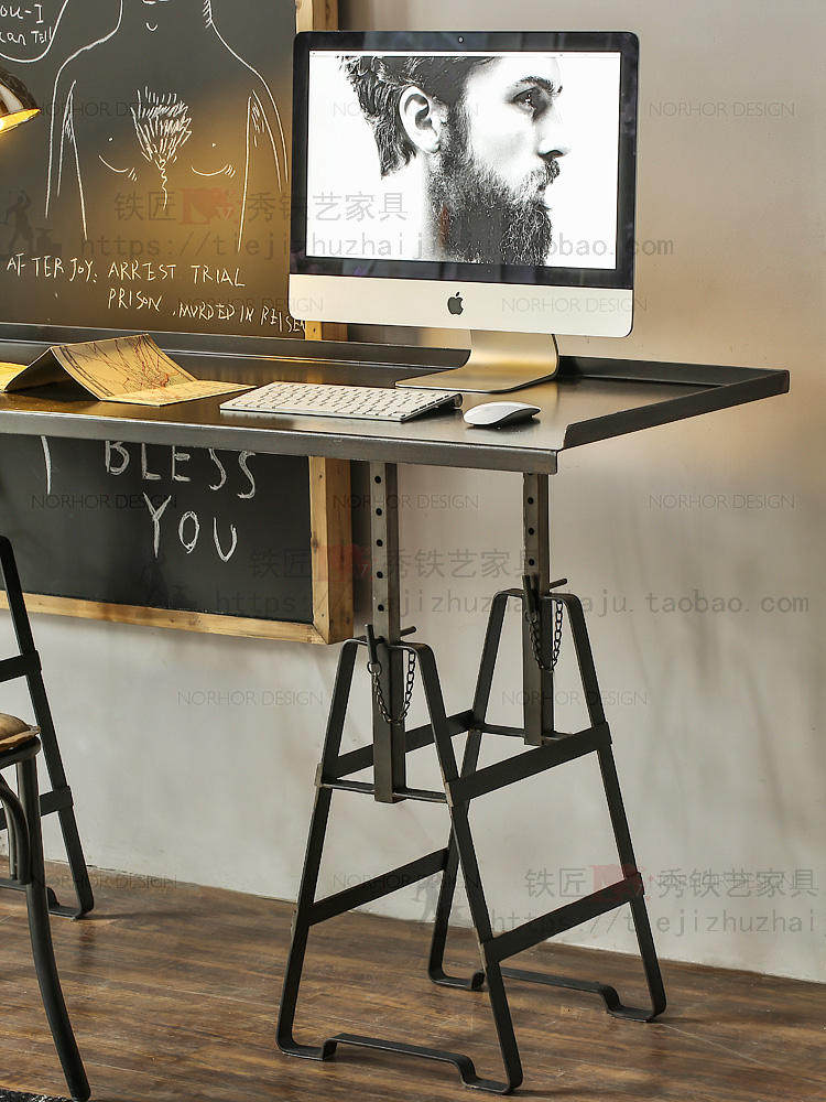American retro Wrought iron industrial style metal desk Office desk Computer desk Iron desktop Adjustable height lifting table