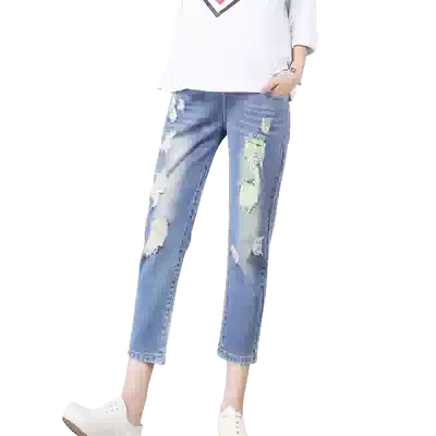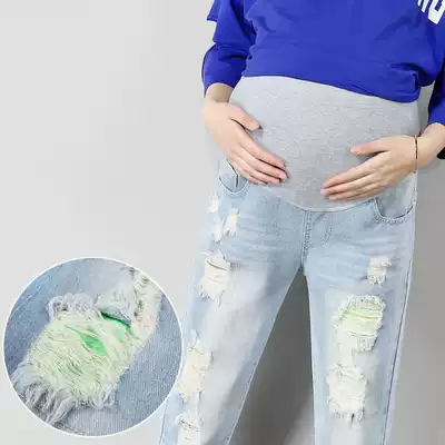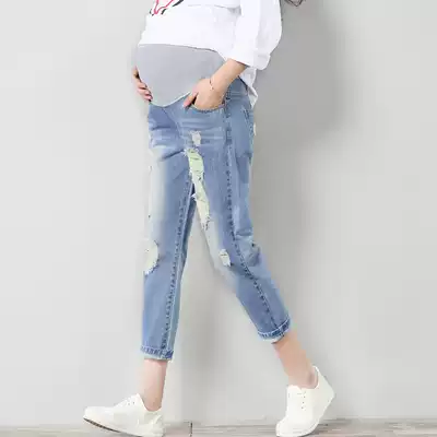 Pregnant women jeans spring and autumn hole plus size tide nine points pregnant women early pants early pregnancy pants large size