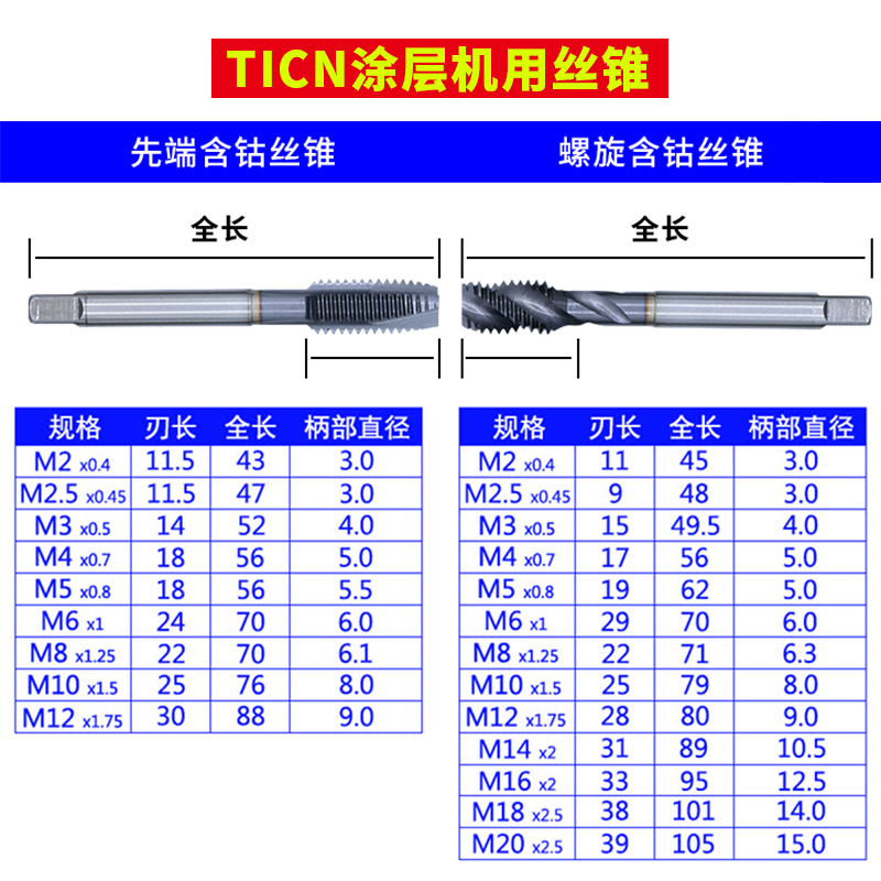 M2X0 4 spiral (tapping blind hole) M2 5X0 45 spiral (tapping blind hole) M3X0 5 spiral (tapping blind hole) M4X0 7 spiral (tapping blind