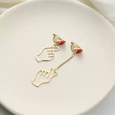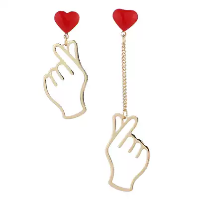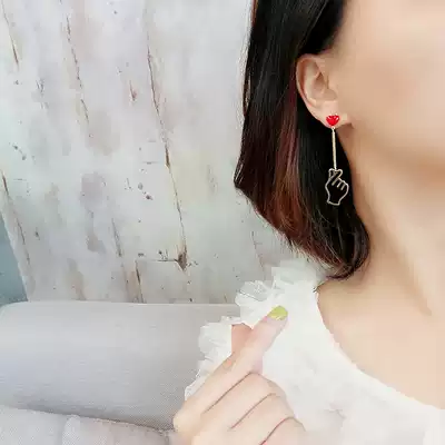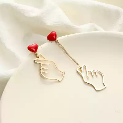 Hand than heart Red Love earrings Korea s925 silver needle earrings personality asymmetry earrings earrings ear clip no earrings female