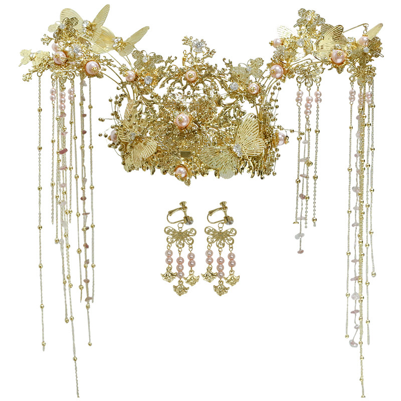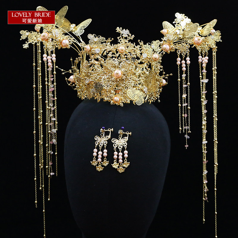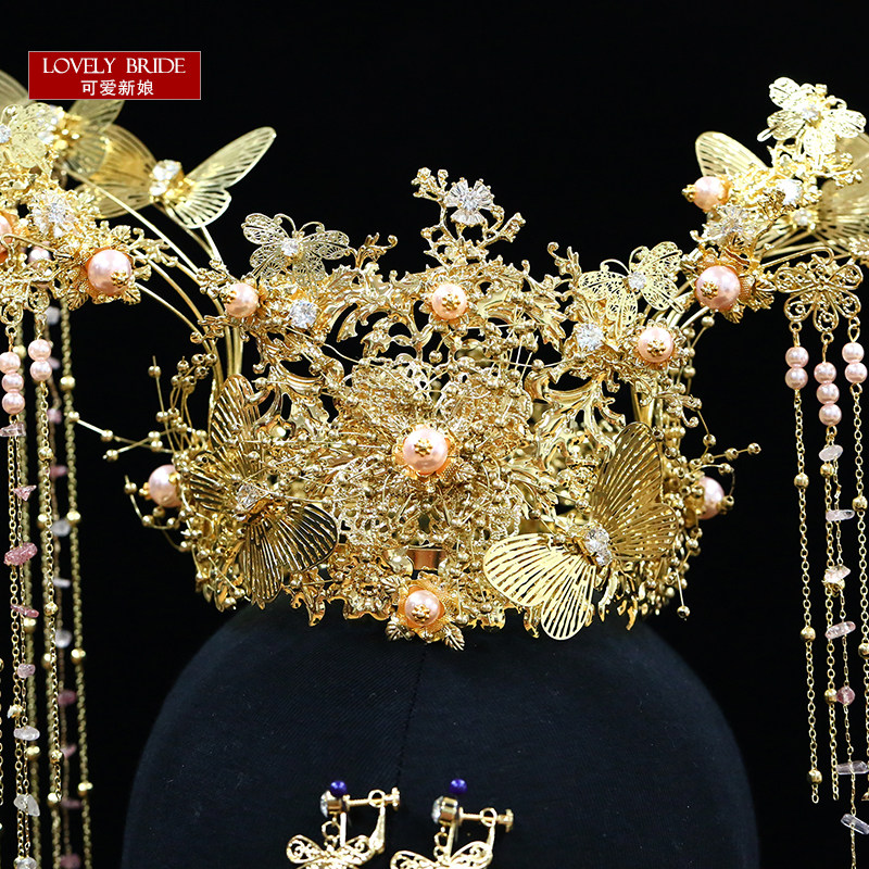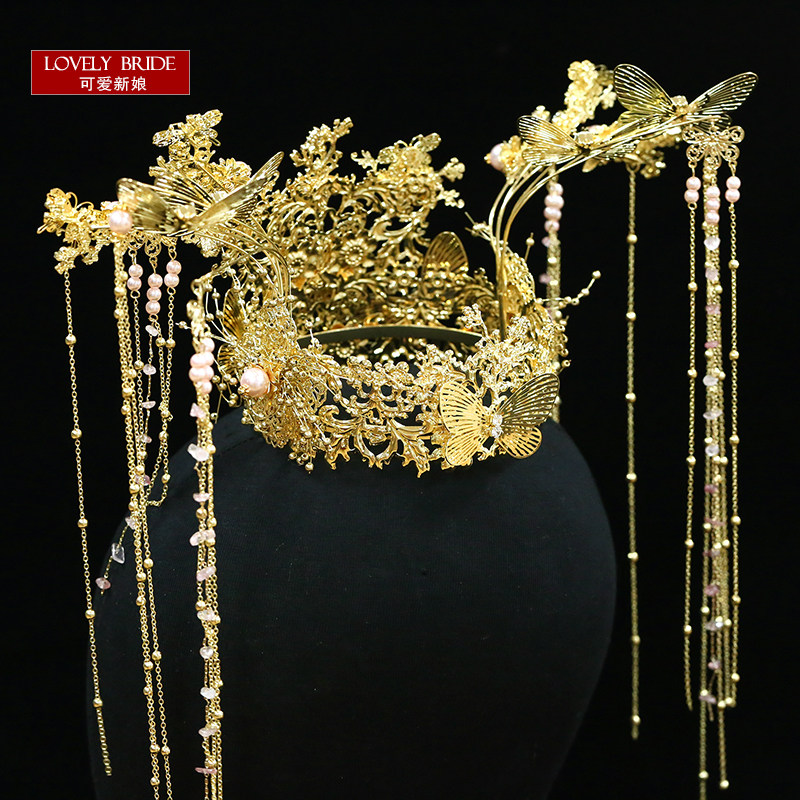 Cute bride Chinese style ancient costume golden round phoenix crown bride wedding Xiuhe Hanfu long fringed ancient style hair accessories