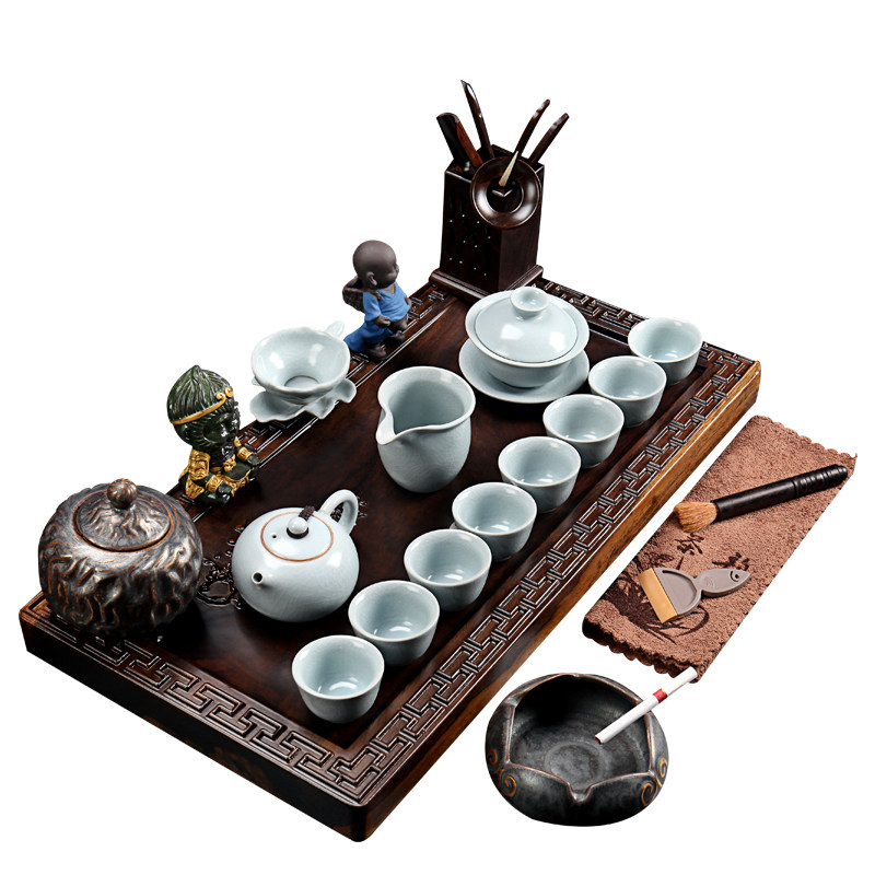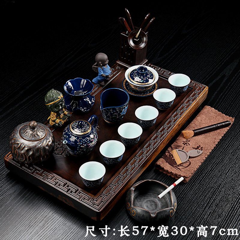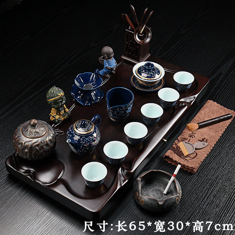 Zhibai ebony solid wood tea set set Household ceramic tea pot Simple Kung Fu tea tea set Tea tray