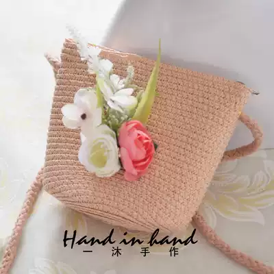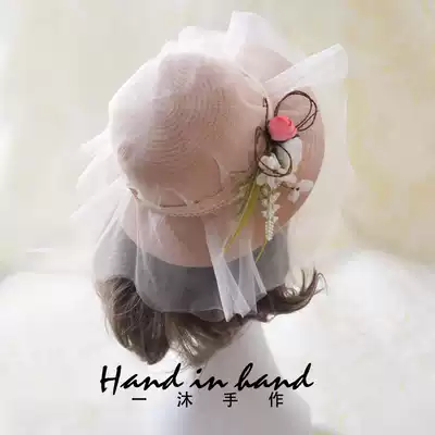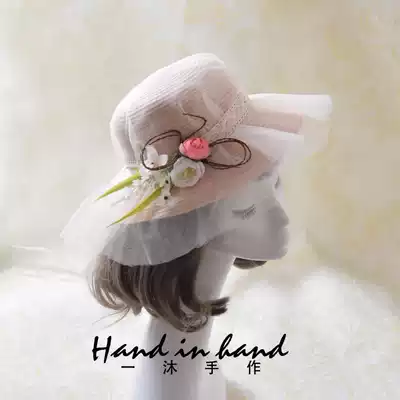 South Korea's new spring and summer retro flat-top straw hat flower straw bag daughter children's sunshade sunscreen princess sunshade