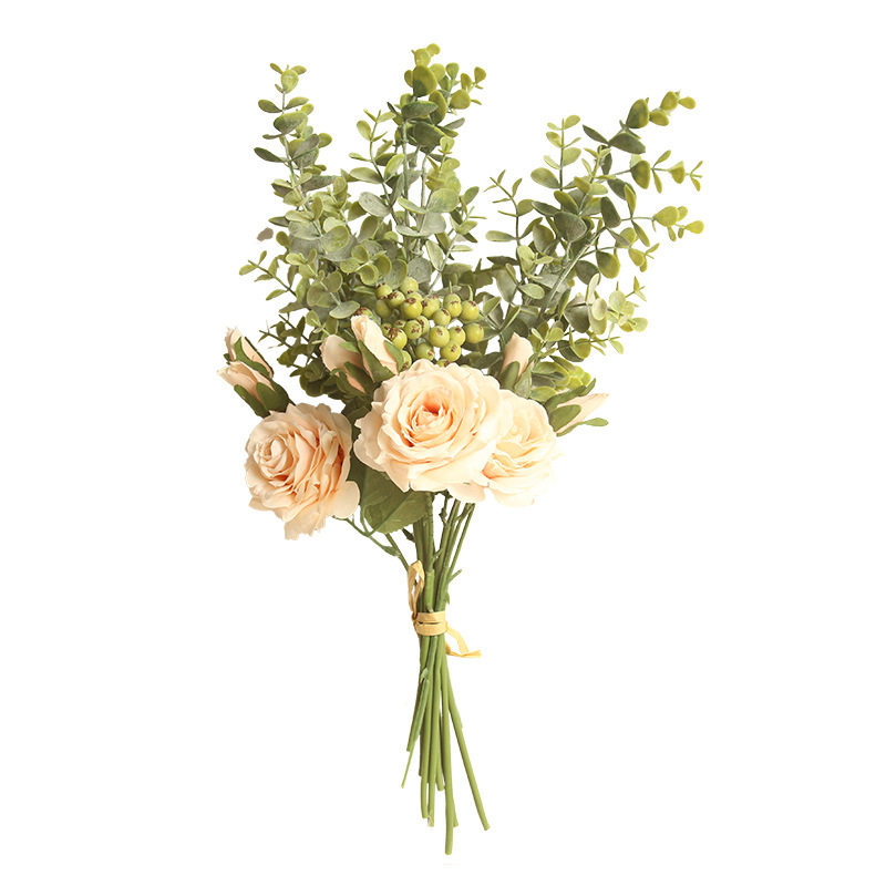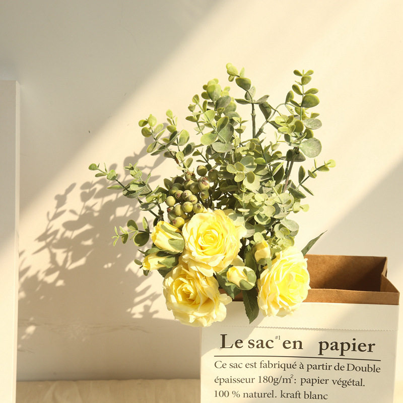 Simulation hand tied rose bouquet Eucalyptus INS Nordic style home decoration plastic fake flower bottle silk cloth