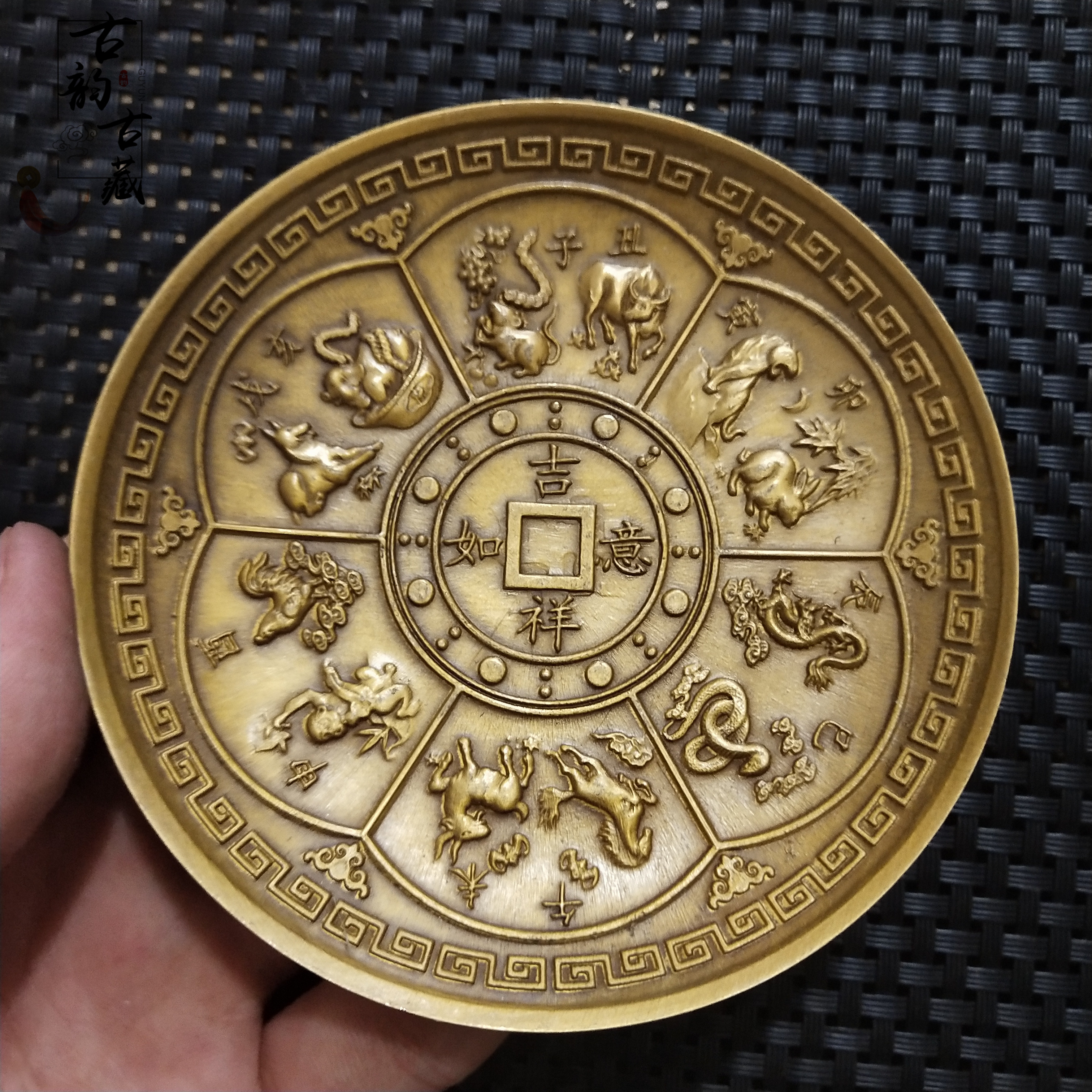 Antique antique copper plate Copper bowl ornaments Auspicious auspicious Zodiac Household Feng Shui plate imitation Qianlong year bottom section
