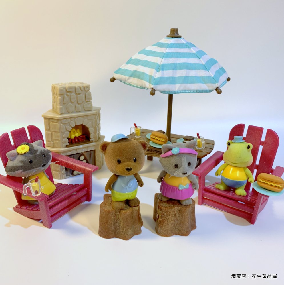 Garden chair table parasol barbecue accessories 23p Kitchen housework accessories 21p1 Pink puppy 2 red hedgehog 3 red skirt kitten 4 yellow skirt raccoon cat 5 small turtle 6 blue bear 7 blue pants calf 8