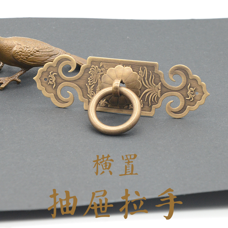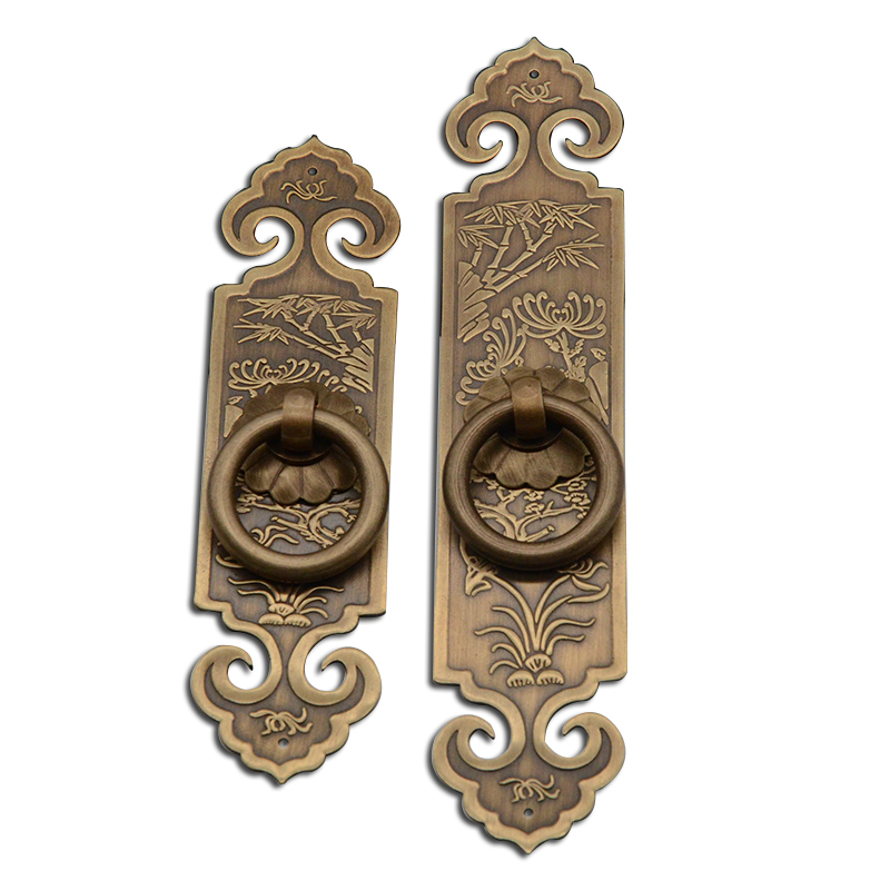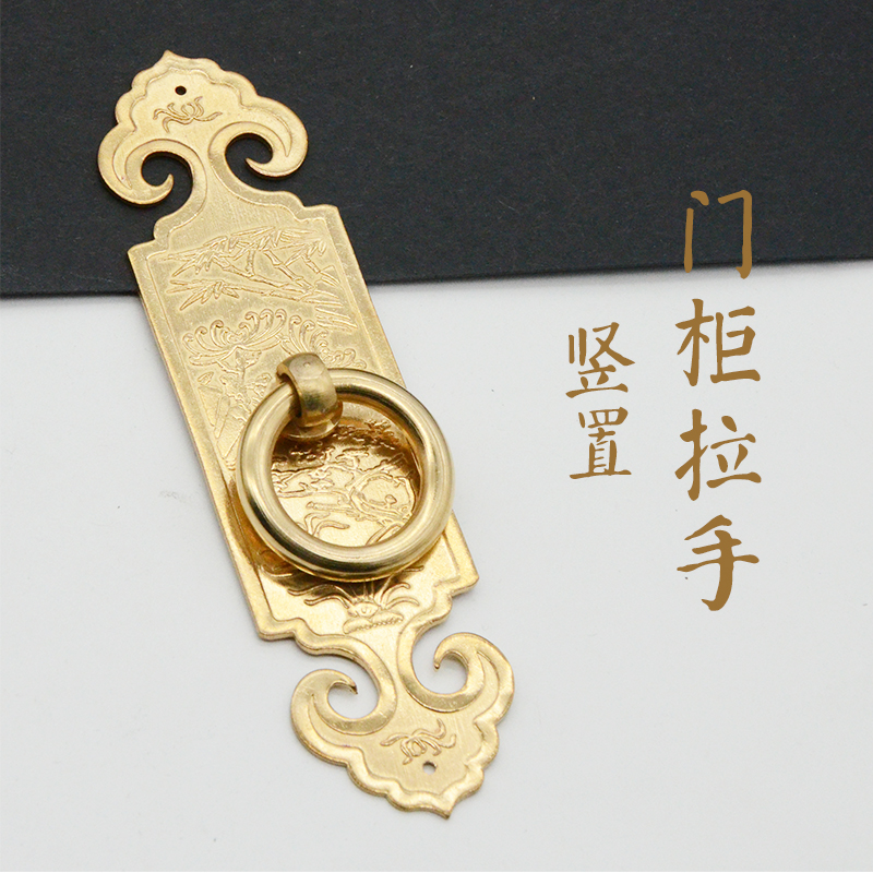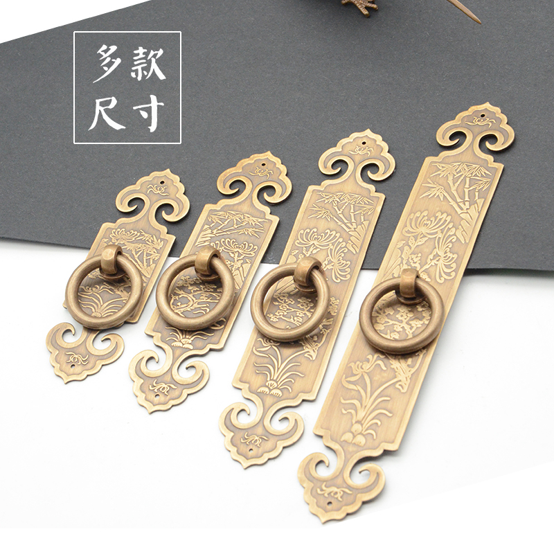 Chinese antique pure copper straight handle plum orchid bamboo chrysanthemum portraying book wardrobe door drawer handle single hole pull ring handle