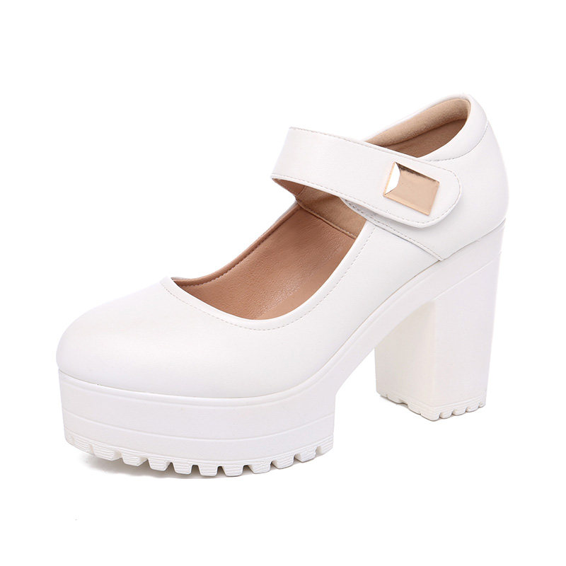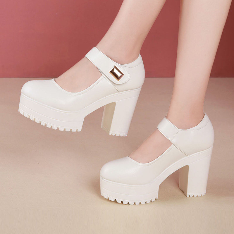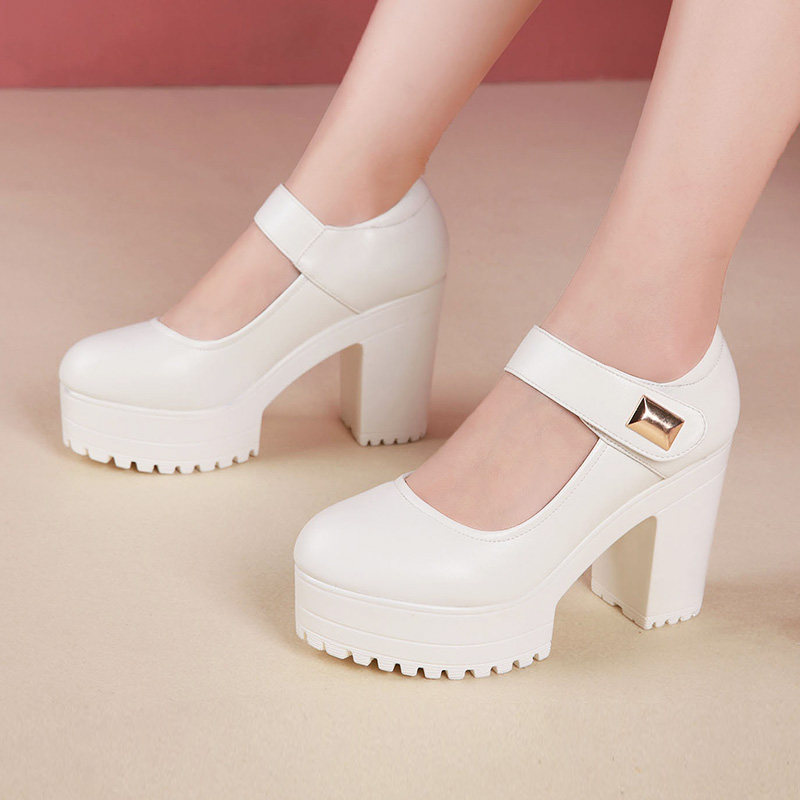 Bangrobe model shows high heels female white thick heel waterproof table round head leather T stage performing female single shoes