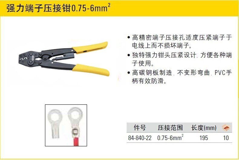 American Stanley tools 84-840-22 strong terminal crimping pliers 0 75-6mm2 square
