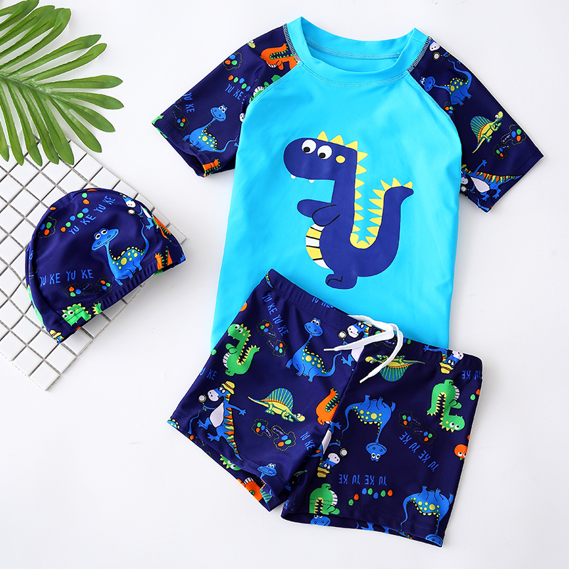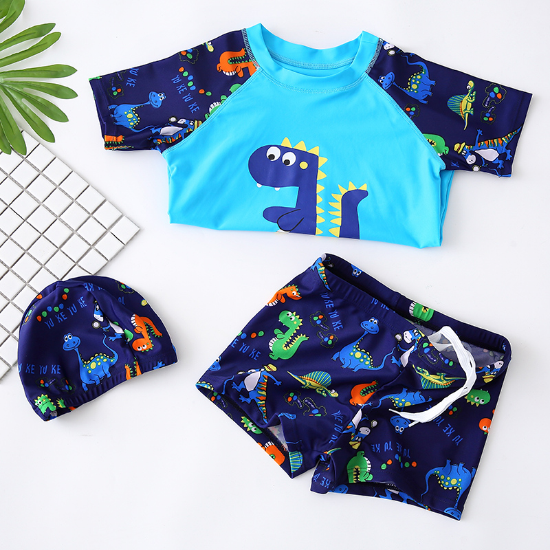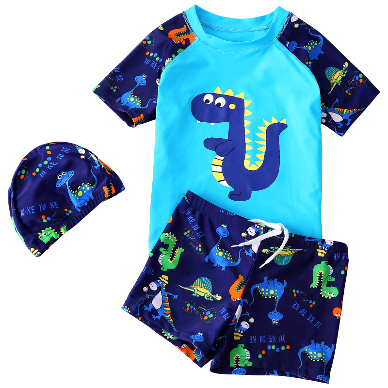 Blue little dinosaur three-piece set(swimming trunks swimsuit swimming cap) White little dinosaur three-piece set(swimming trunks swimsuit swimming cap) Blue little monster three-piece set(swimming trunks swimsuit swimming cap) White 1
