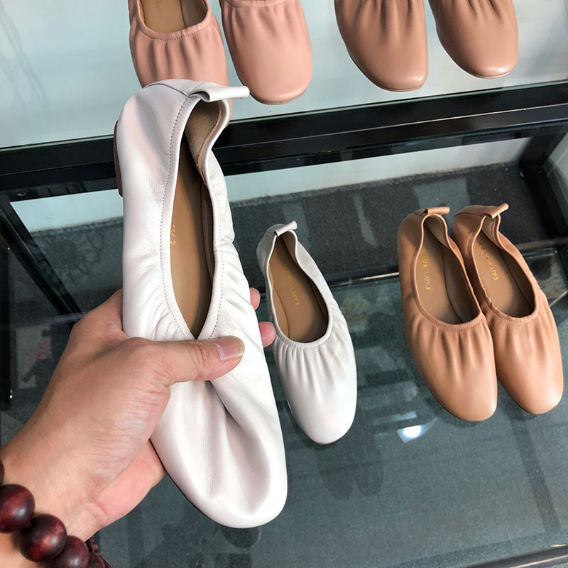 Soft leather grandma shoes women's spring and autumn genuine leather retro all-match flat bottom pleated single shoes comfortable large size ballet peas shoes