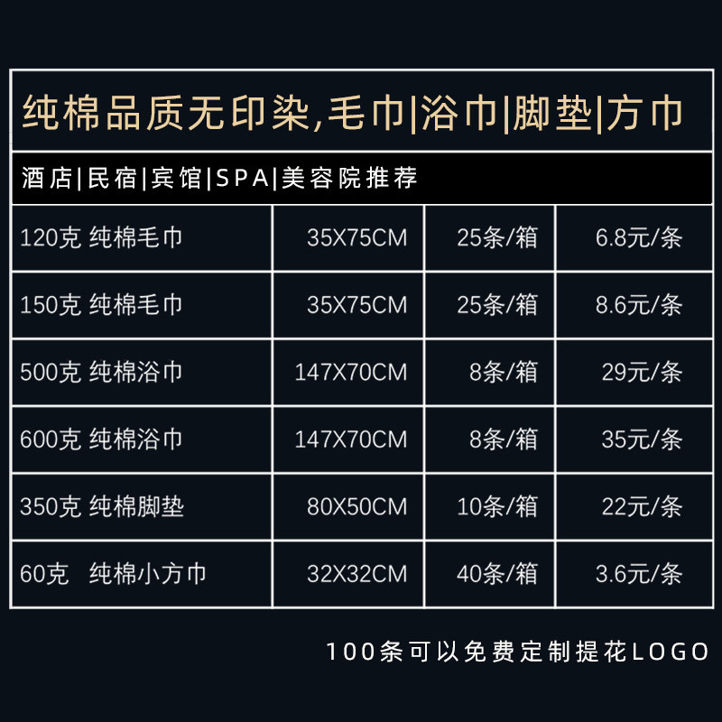 (25) 120g Cotton Towels (25) 150g Cotton Towels (8) 500g Cotton Bath Towel (8) 600g Cotton Bath Towel (40) 6