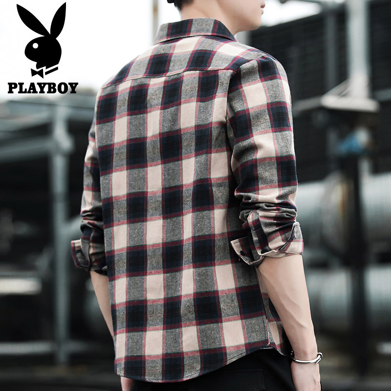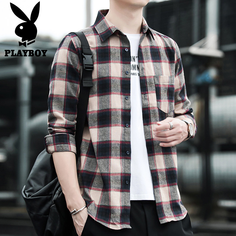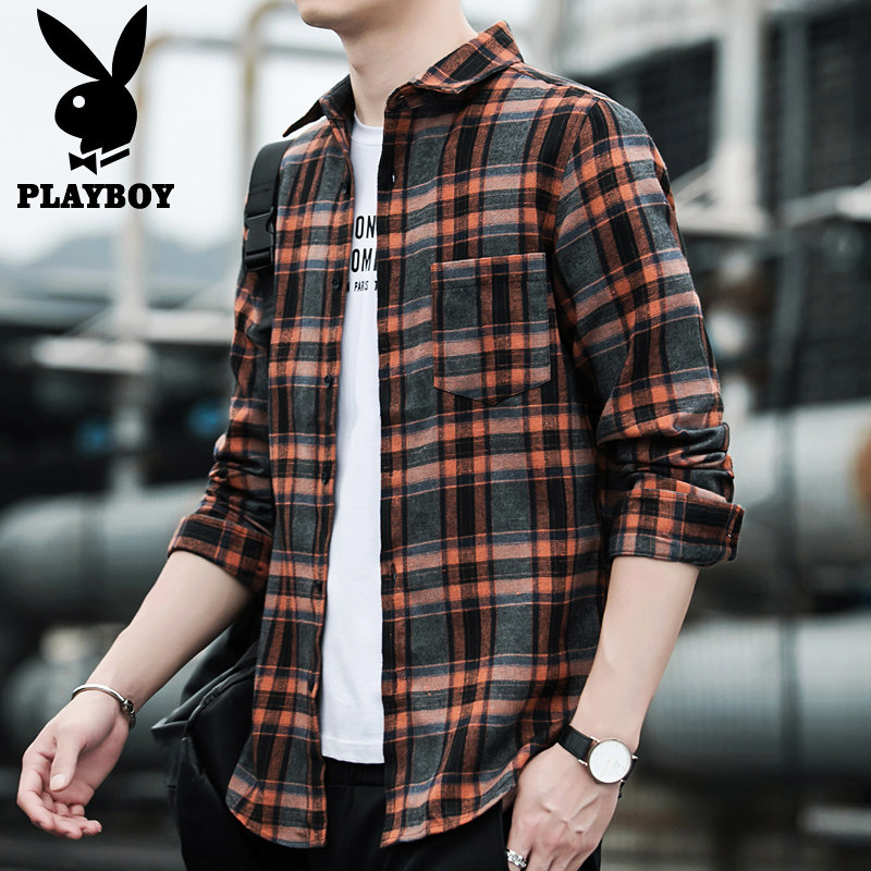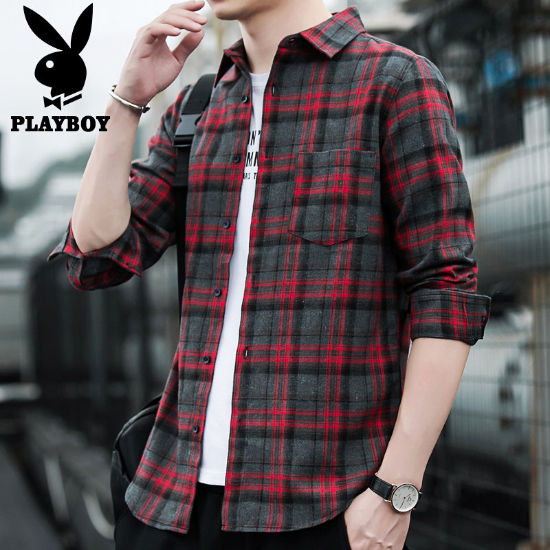 Playboy black and white plaid shirt Men's long-sleeved shirt Korean version of the trend casual wild ins loose jacket