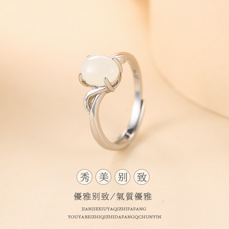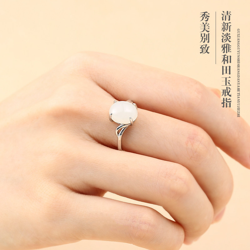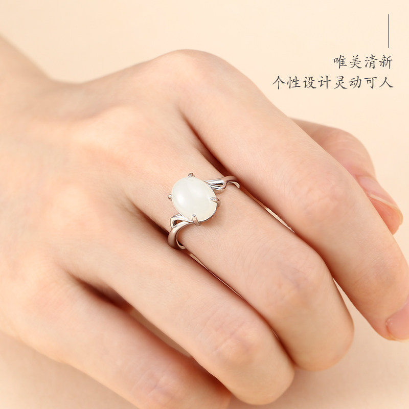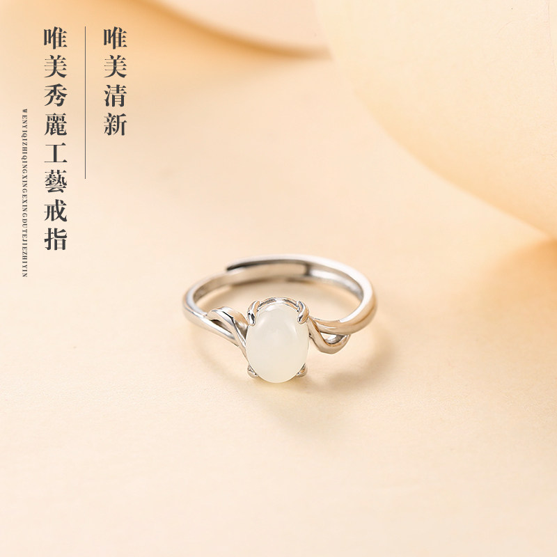 Jade Hetian jade ring 925 sterling silver ring female simple and elegant net red ring fashion temperament single ring