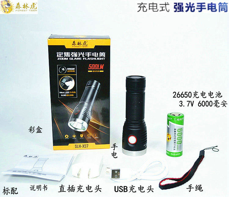Forest Tiger Bright Light Flashlight X57 Home Super Bright Outdoor Mini 26650 Lithium battery is small and bright to charge